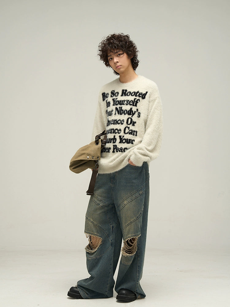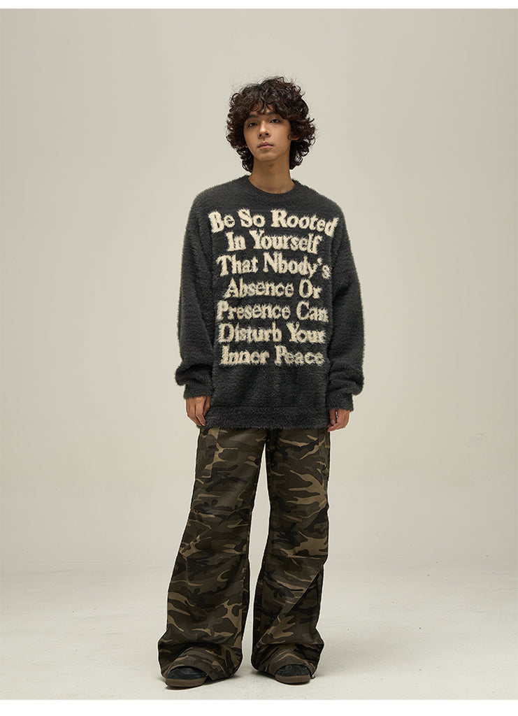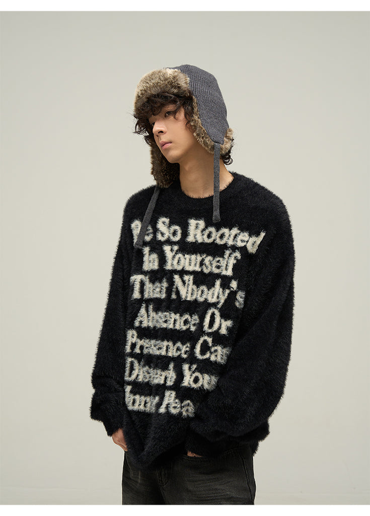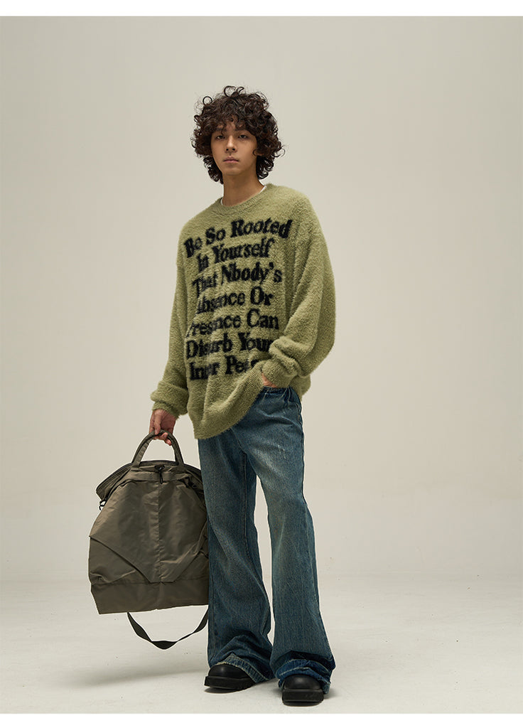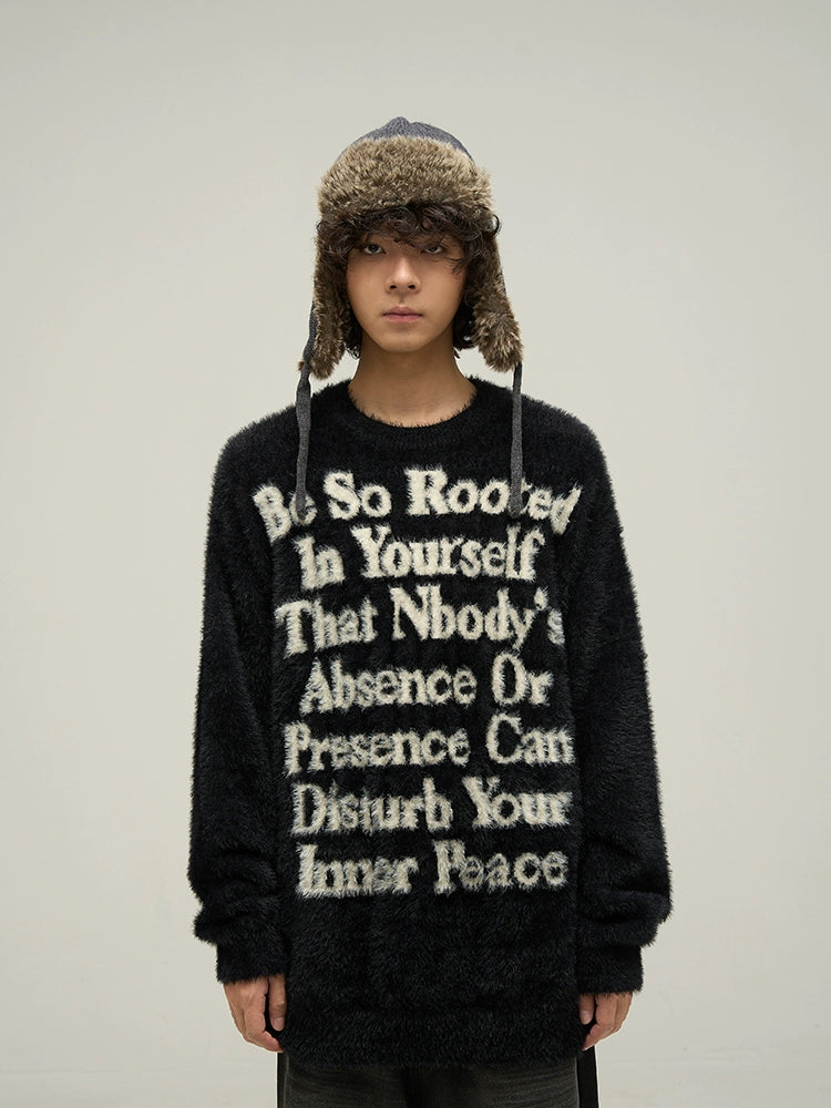 WLNEXT knit wool-blend sweater, rib crewneck/cuffs/hem, text at front.
