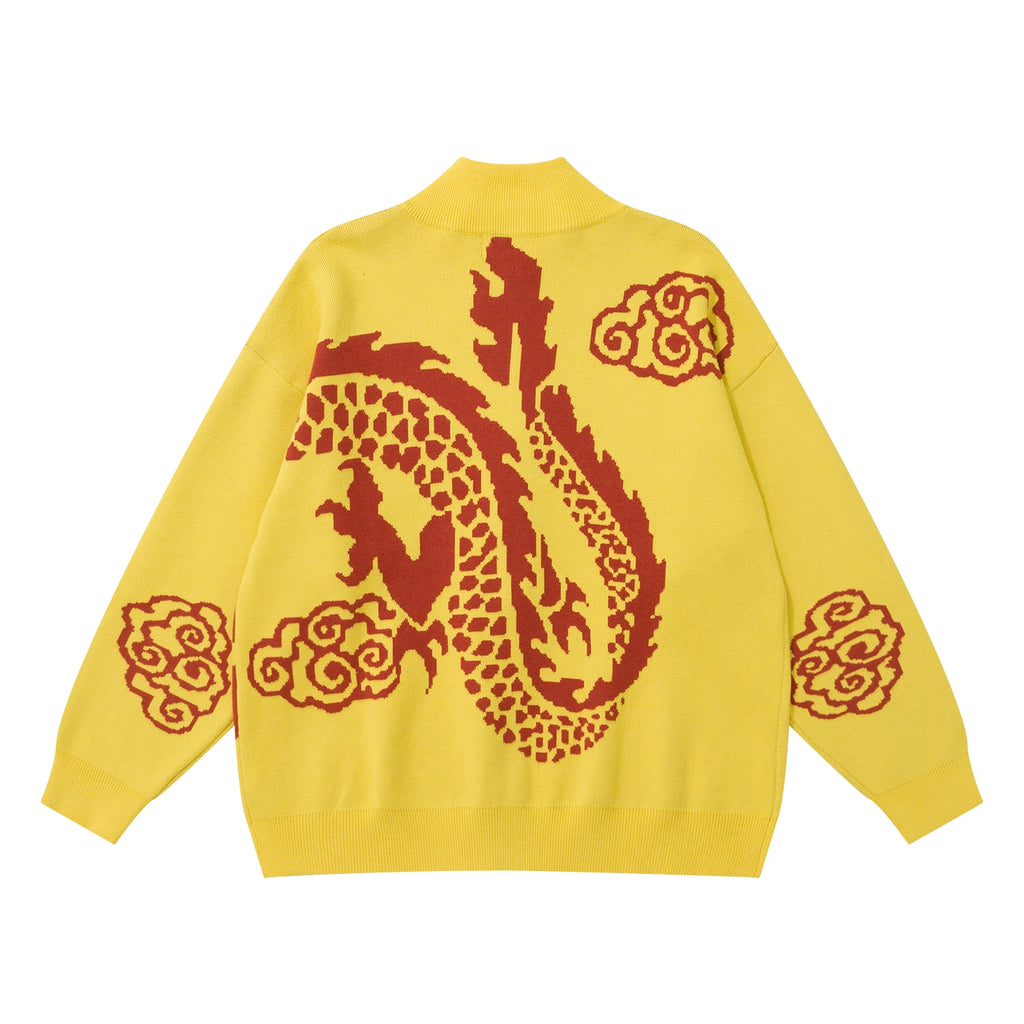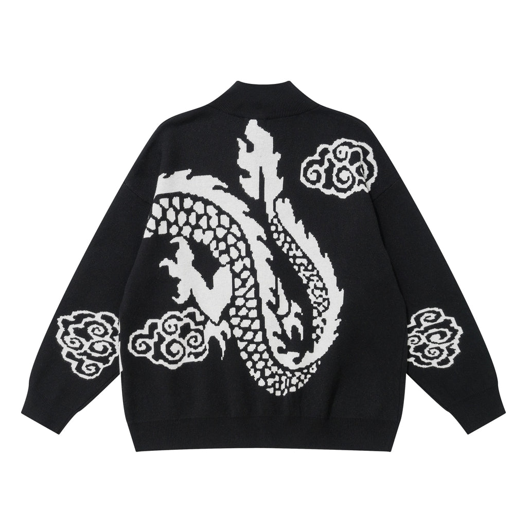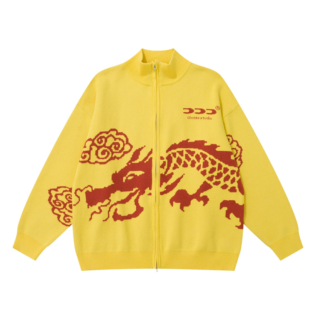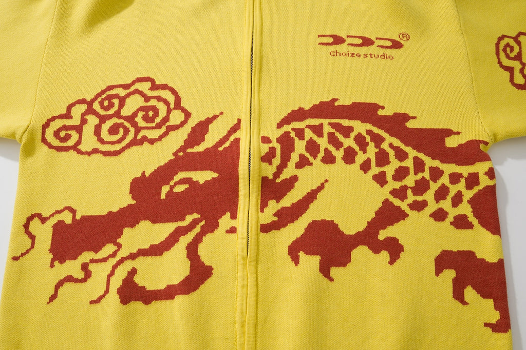 Choize Studio paneled cotton and wool-blend jacket, rib knit crewneck/hem/cuffs, stand collar, zip closure, intricate dragon design and clouds sewn throughout - detailing its head at front and tail at back.