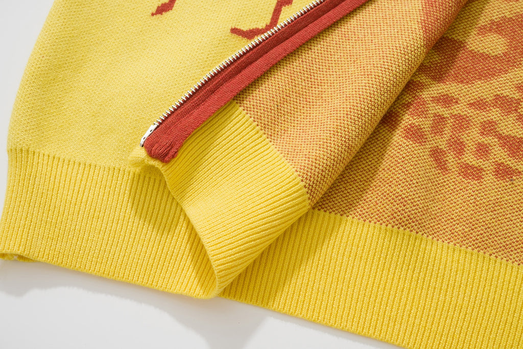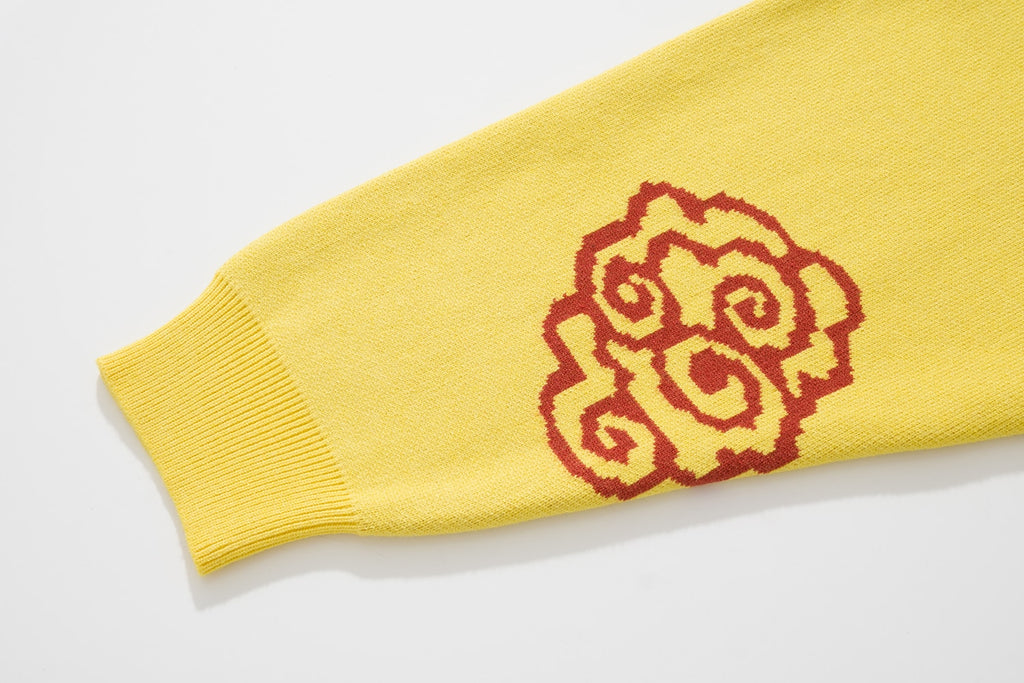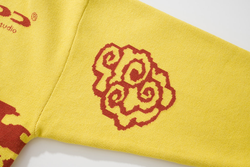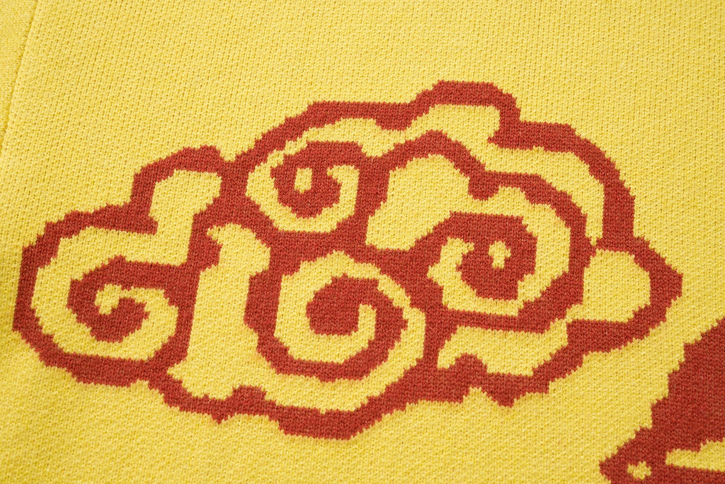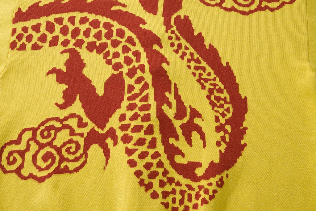Choize Studio paneled cotton and wool-blend jacket, rib knit crewneck/hem/cuffs, stand collar, zip closure, intricate dragon design and clouds sewn throughout - detailing its head at front and tail at back.