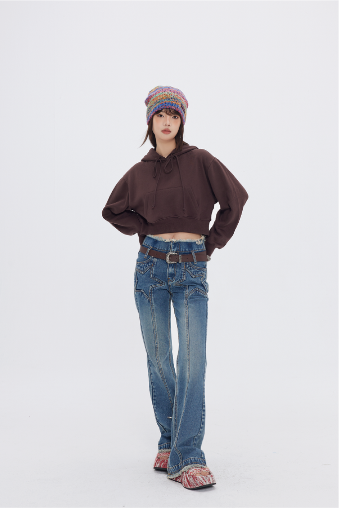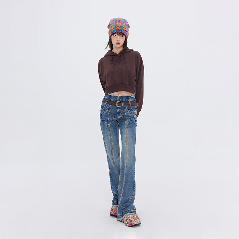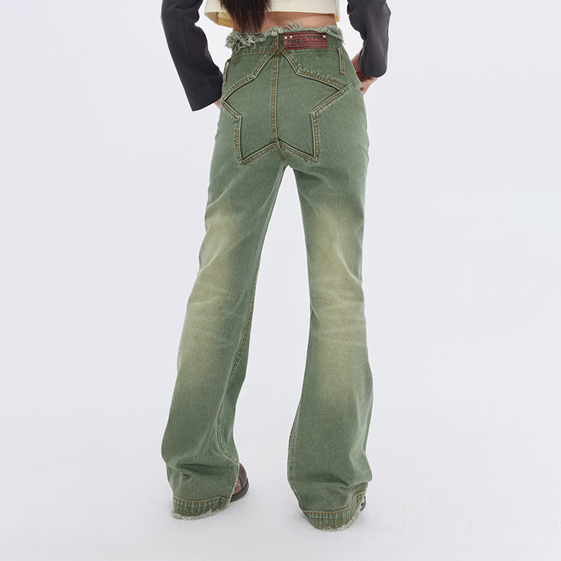 FPMZ flared denim jeans, fading and stars stitched throughout, belt loops, zip-fly, two-pocket styling, frayed edges at waistband and cuffs, logo-engraved silver-tone hardware at front, logo patch at back.