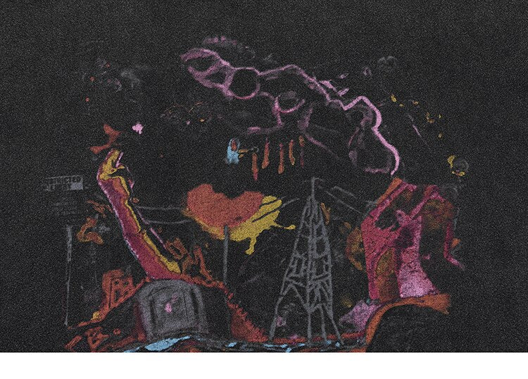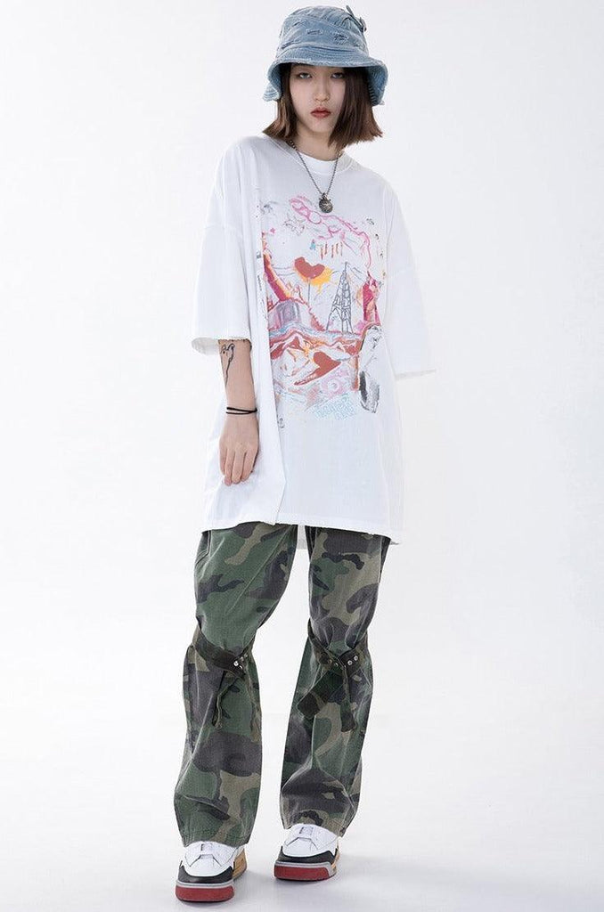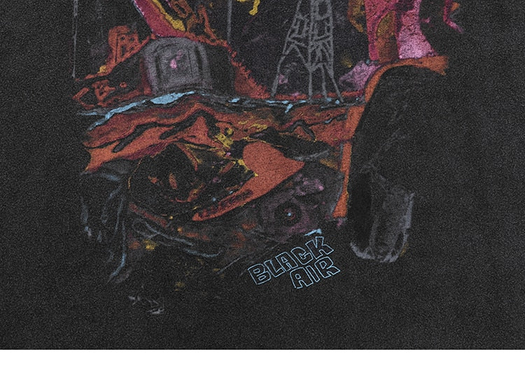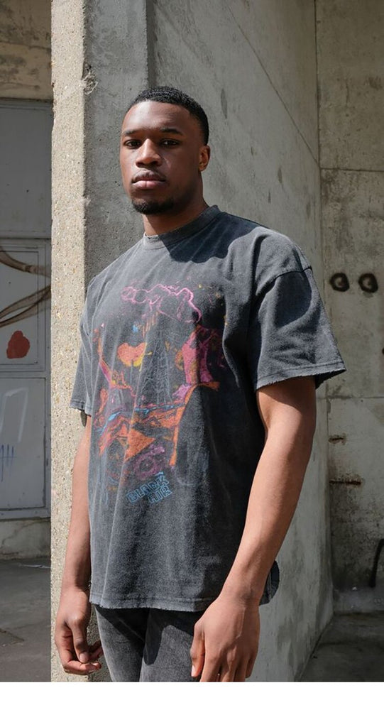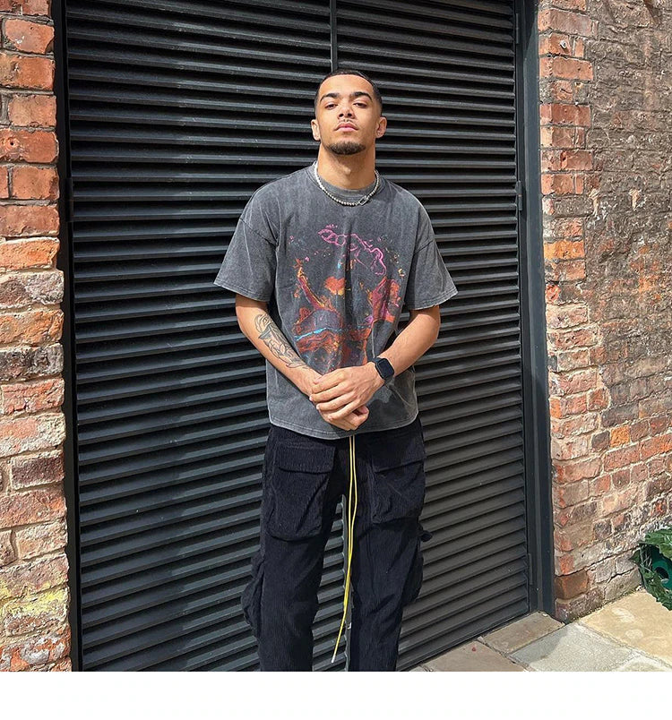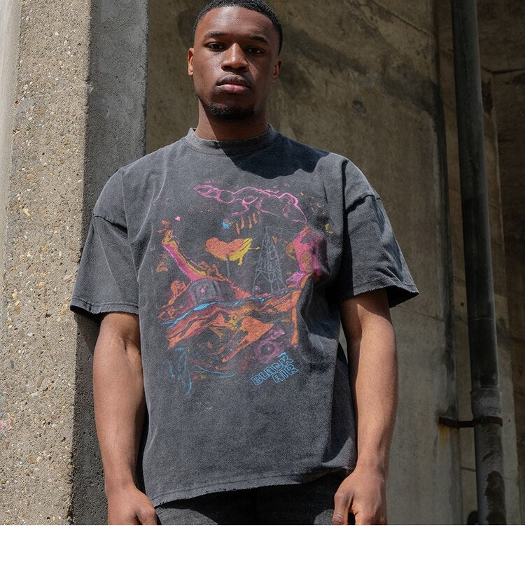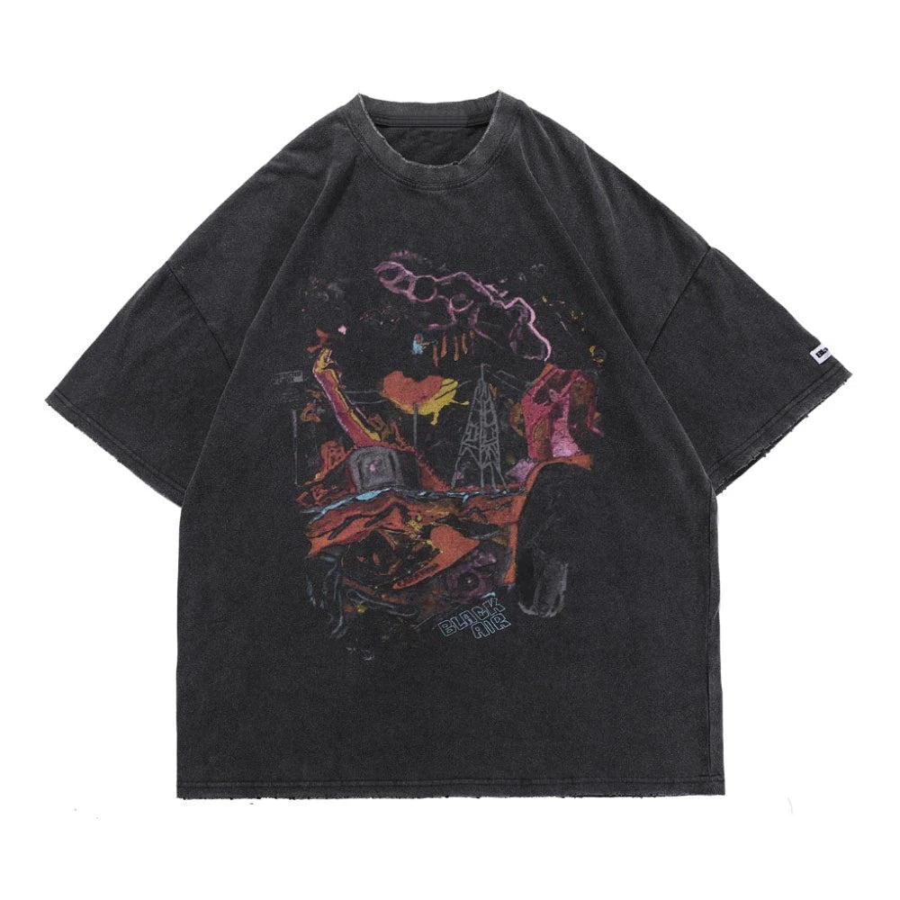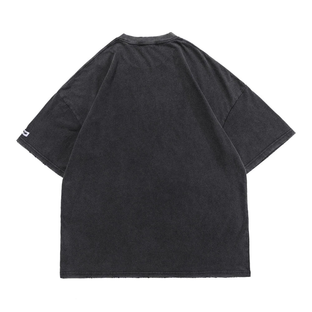 Cotton short sleeve shirt, slight fraying at rib knit crewneck/hem/cuffs, dropped shoulders, design embedded at front for a long lasting print. Hand-washed staining for a vintage look & feel.