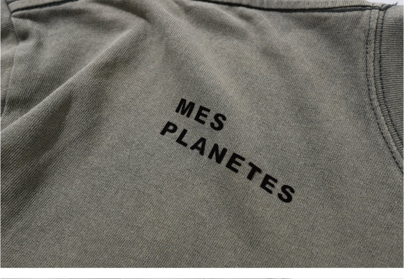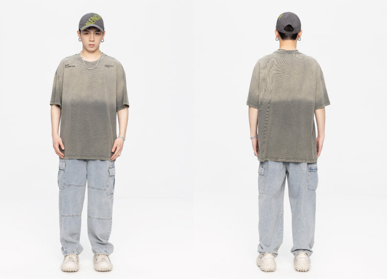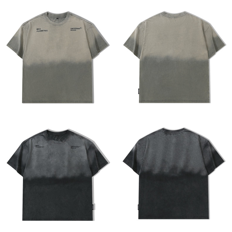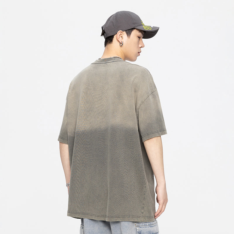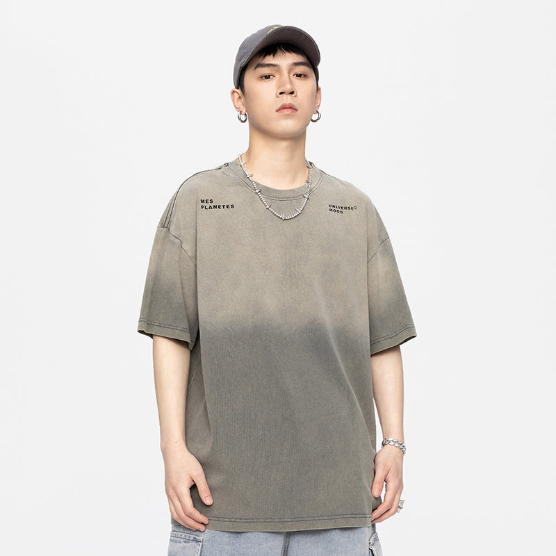 GTRG cotton short sleeve shirt, gradient effect and fading throughout, rib knit crewneck, dropped shoulders, text printed at front.