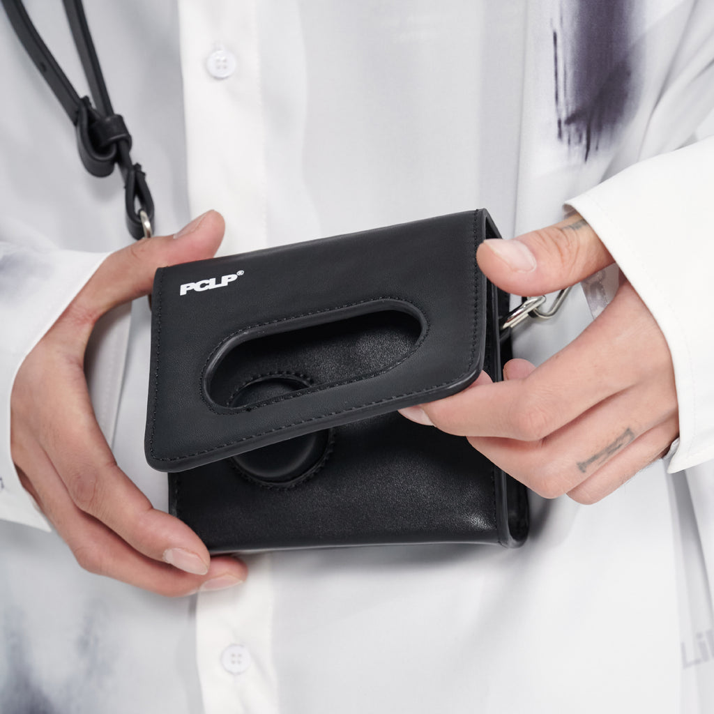 PCLP PU leather shoulder bag in black, adjustable and detachable shoulder strap, cutout at face, foldover flap, patch pocket at interior, silver-tone hardware.