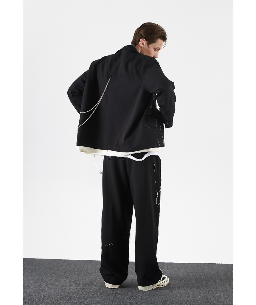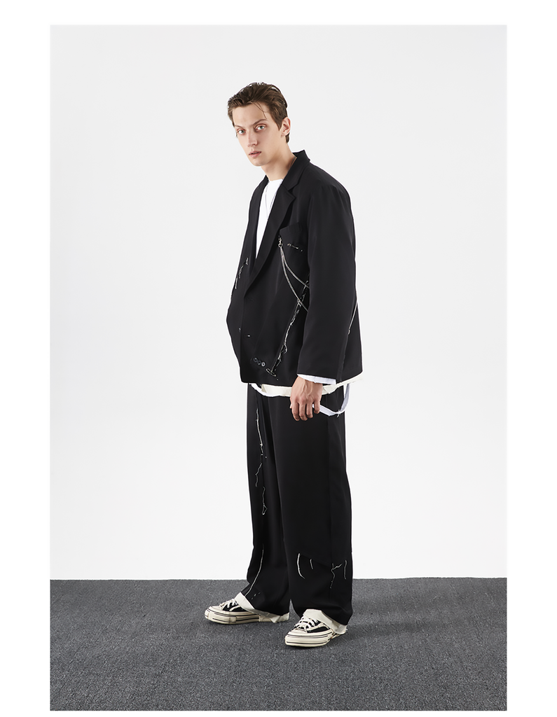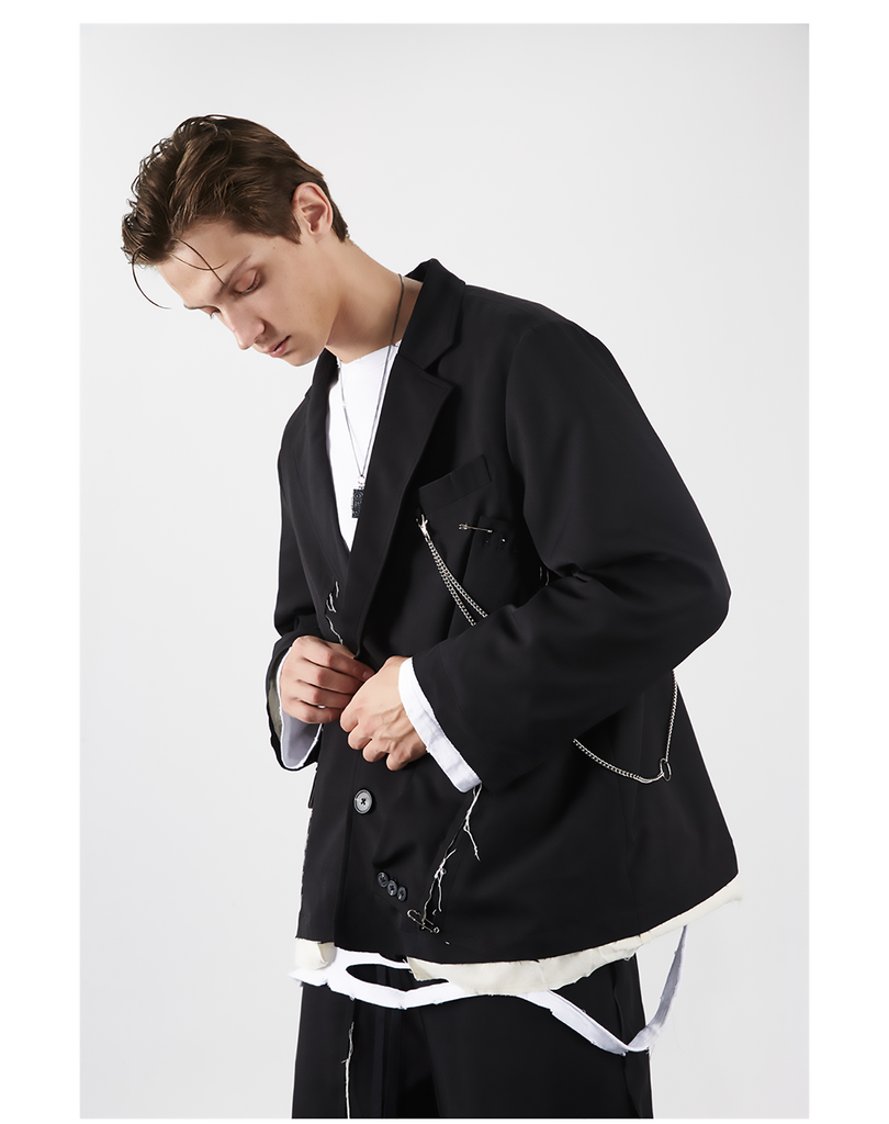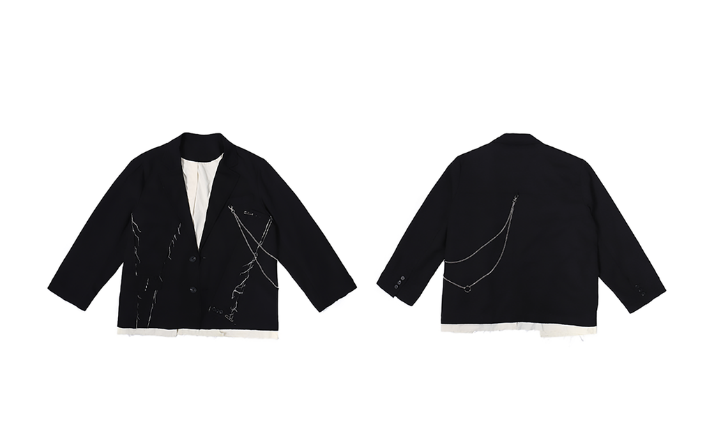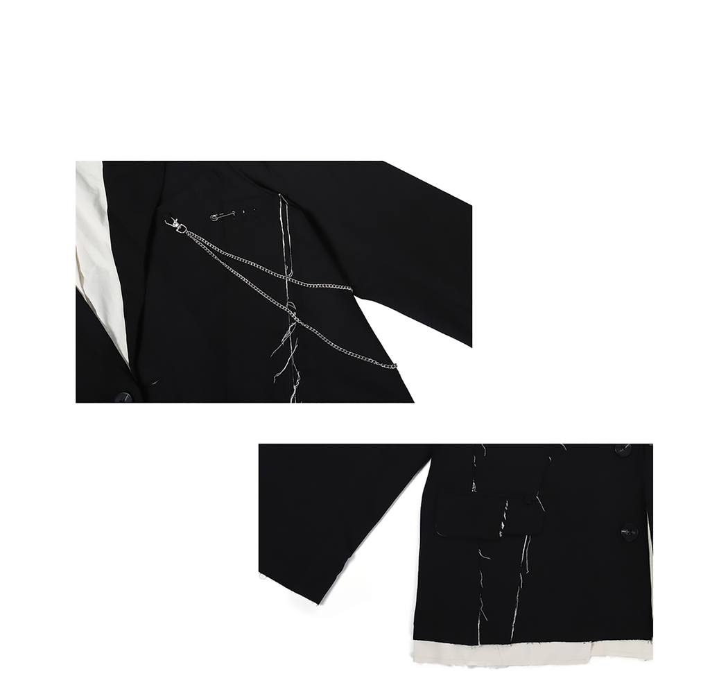 PCLP cotton and polyester-blend blazer, distressing and loose thread detailing at front, notched lapel, flap and welt pockets, detachable chain-link at welt pocket, button closure, three-button surgeon’s cuffs, separate lining attached to hem.