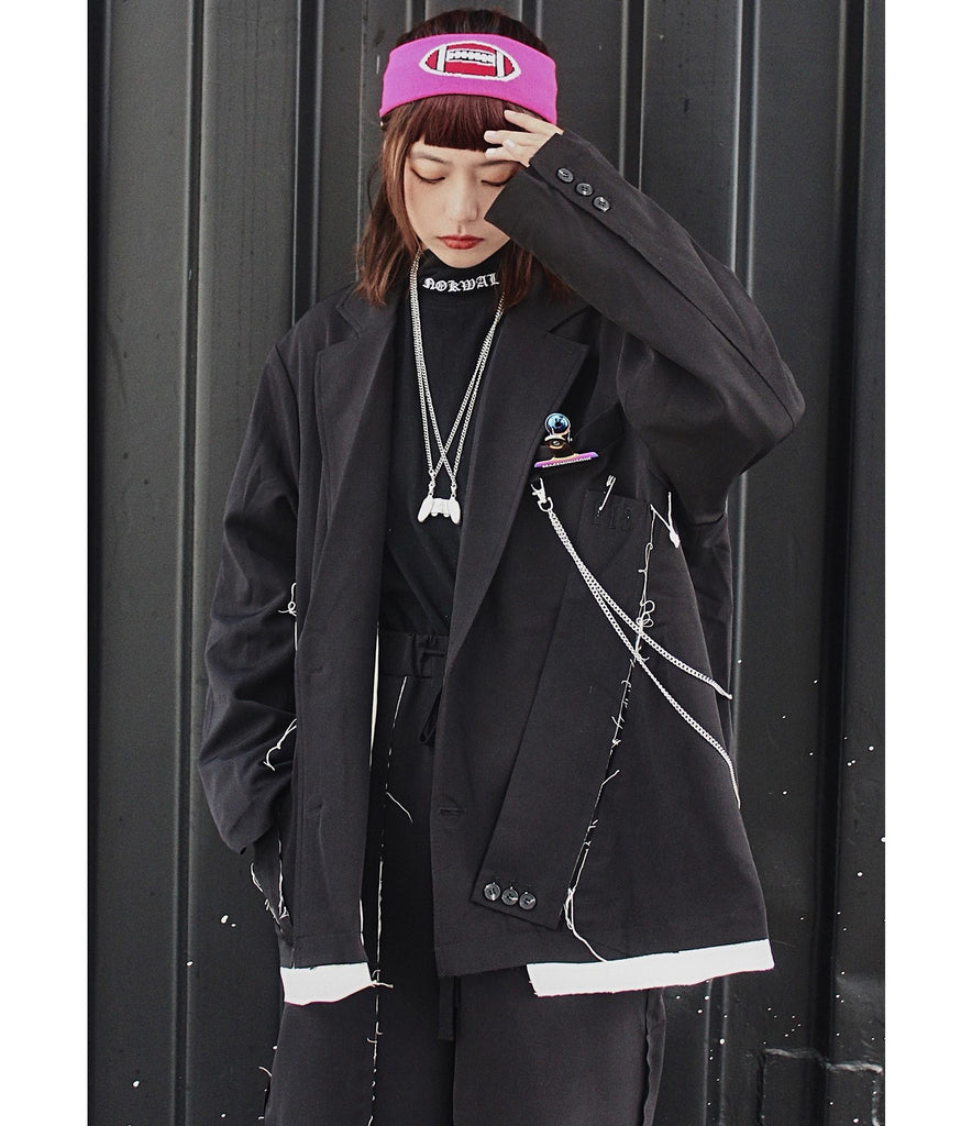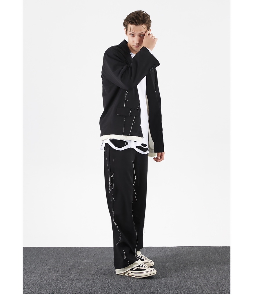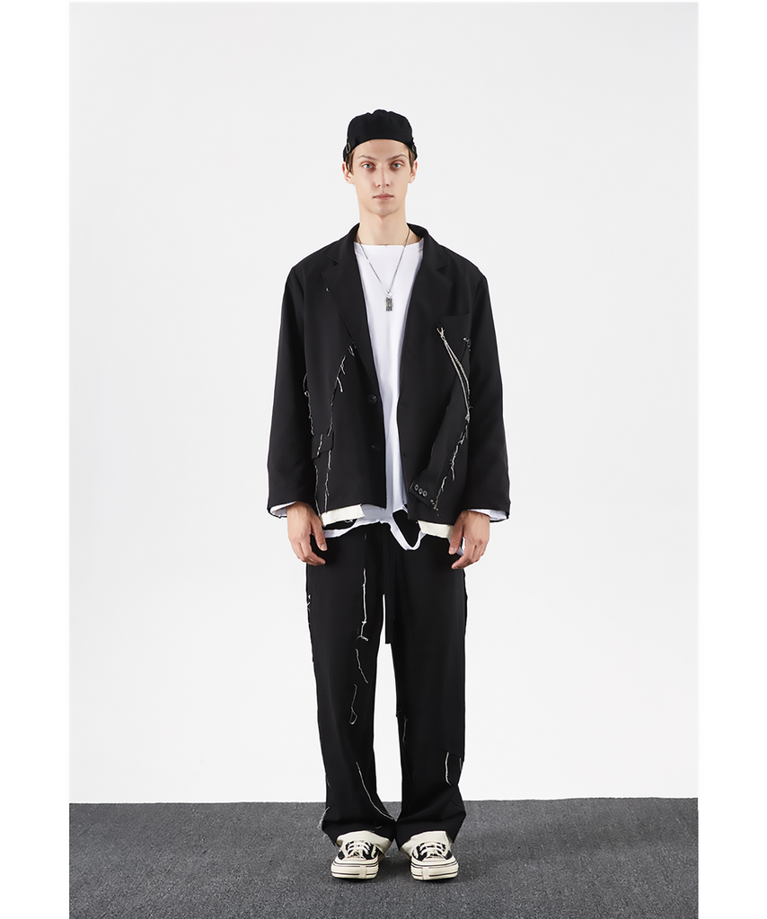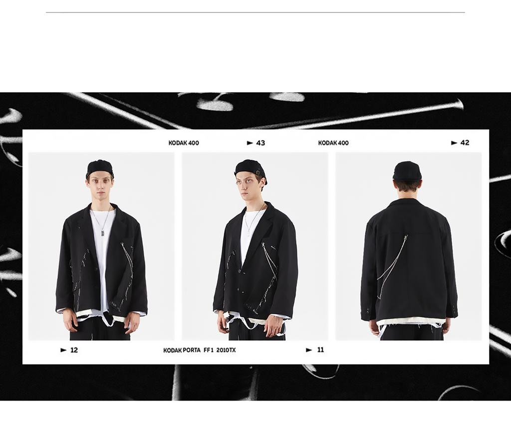 PCLP cotton and polyester-blend blazer, distressing and loose thread detailing at front, notched lapel, flap and welt pockets, detachable chain-link at welt pocket, button closure, three-button surgeon’s cuffs, separate lining attached to hem.