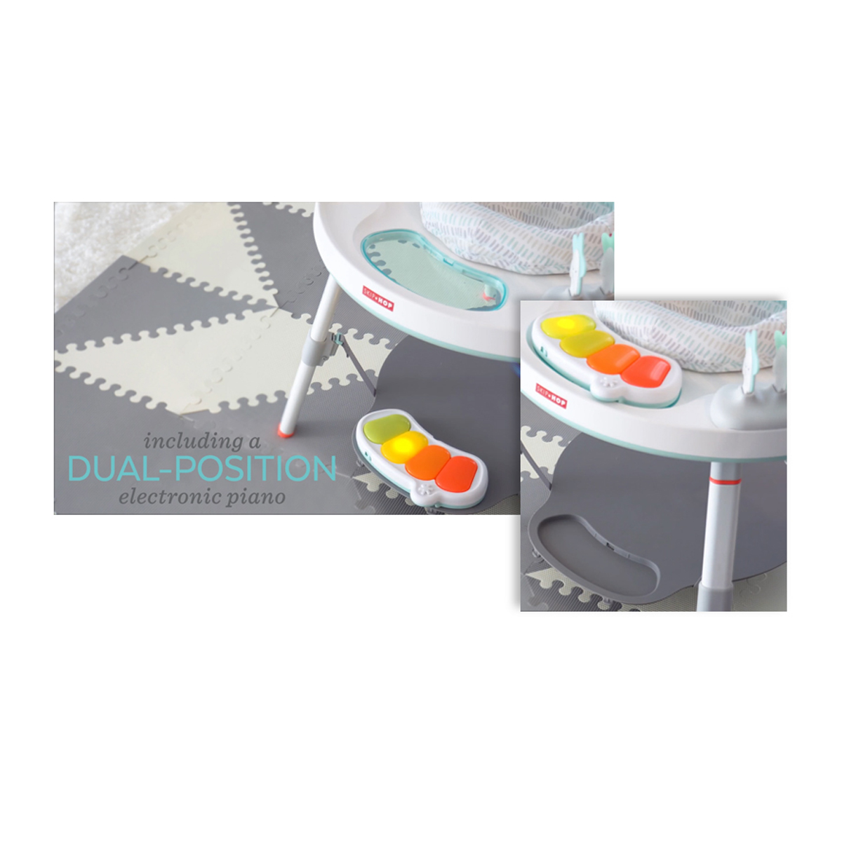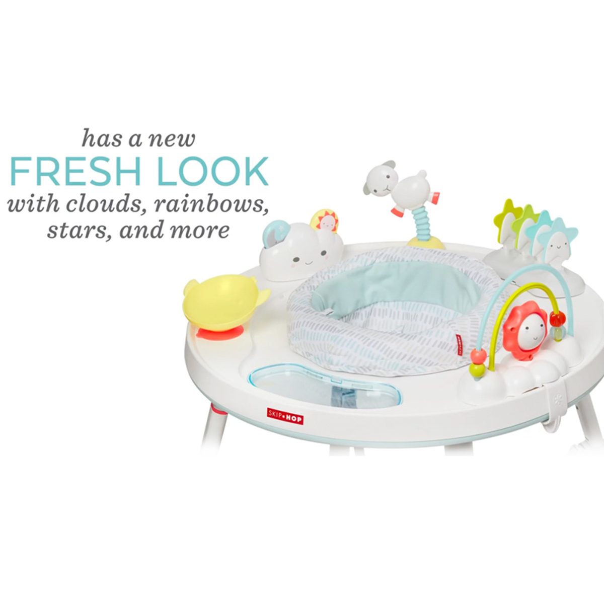 Designed to grow with baby in three stages, Skip Hop's Silver Lining Cloud Baby's View Activity Center is an action-packed take on our best-selling gym. Feauturing the same developmental approach to play and learning as our Explore & More version, the dcor-friendly design features a 360-degree rotating seat that turns and stretches for bouncing. Our unique Discovery Window gives little ones a clear view of their feet as they play the light-up piano to connect cause and effect. Four dreamy toys can be rearranged for customized play. As baby grows, the activity center converts for easy cruising. At stage three, it transforms into a sturdy toddler table with a plastic chalkboard surface for drawing, playingthe sky's the limit!