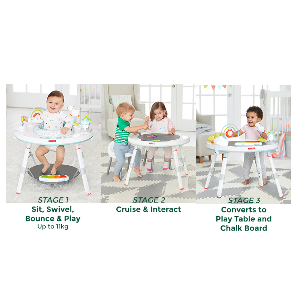 • Three stages of use: Sit, swivel, bounce & play; Cruise & interact; Play table