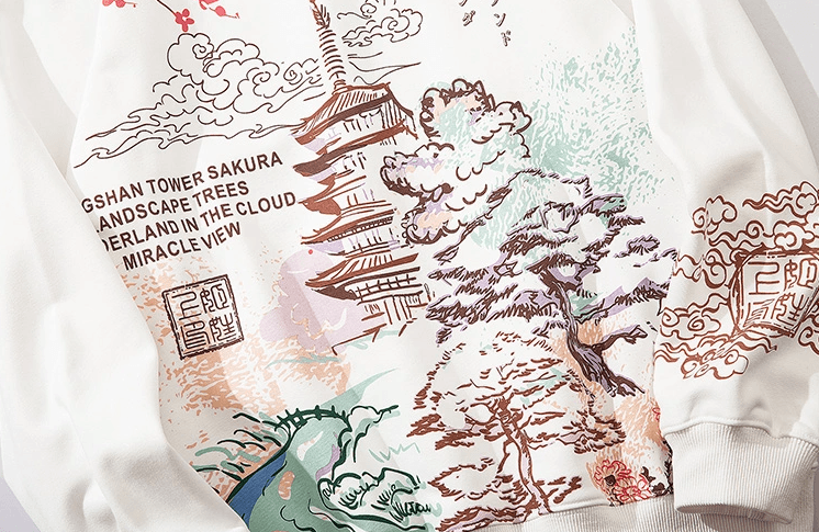Cotton and polyester-blend hoodie, soft fleece interior, rib knit hem and cuffs, drawstring at hood, kangaroo pocket, beautifully designed Japanese scenery - detailing sakura, pagoda, river, and clouds printed at the back, vibrant coloring.