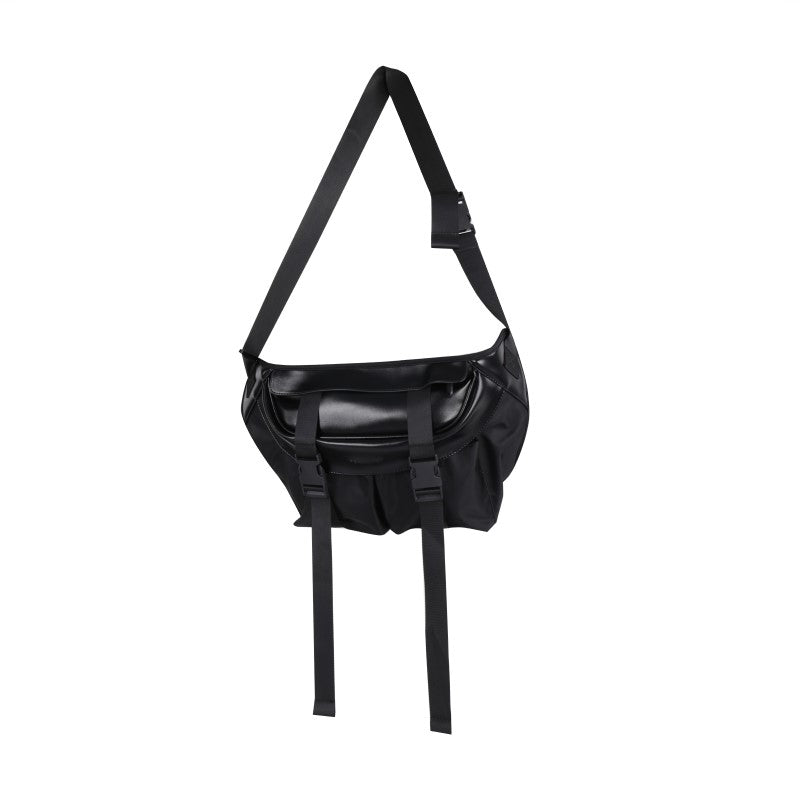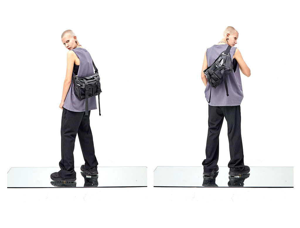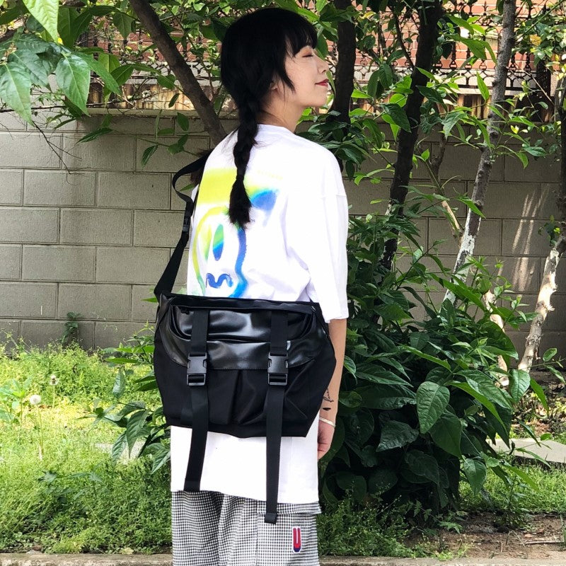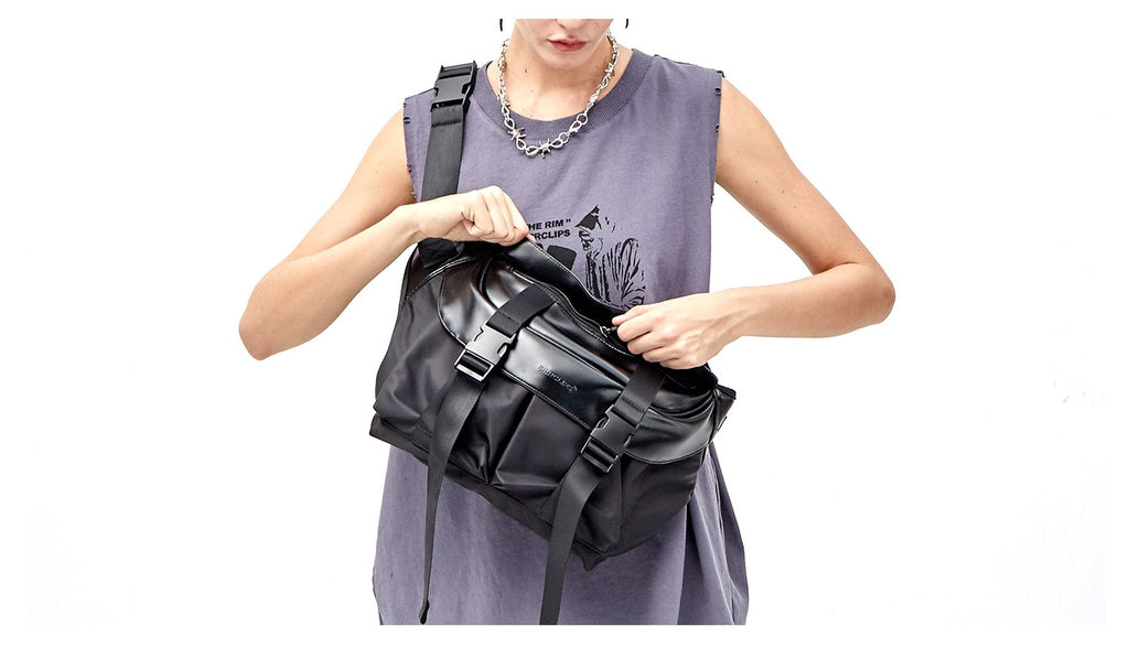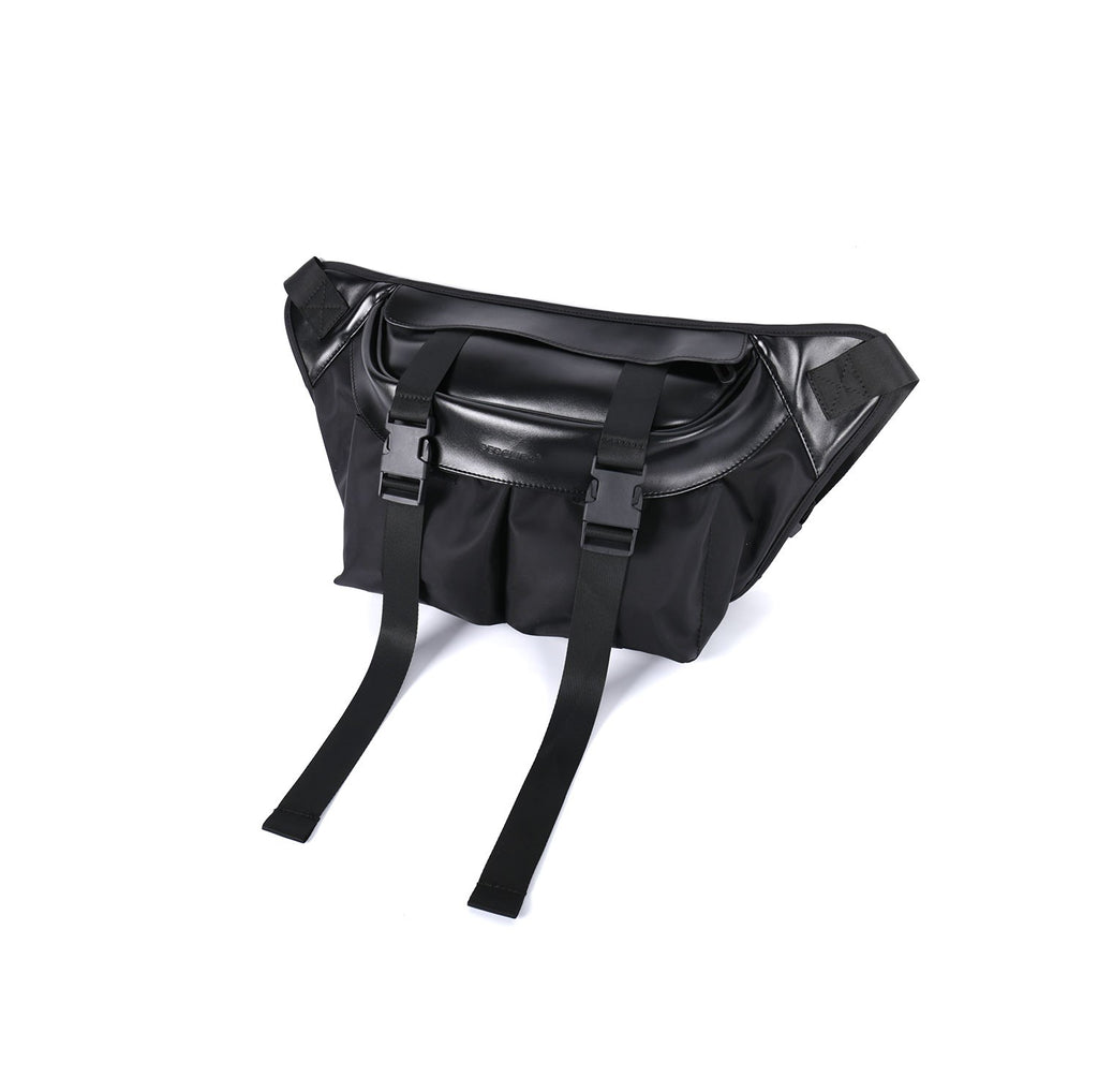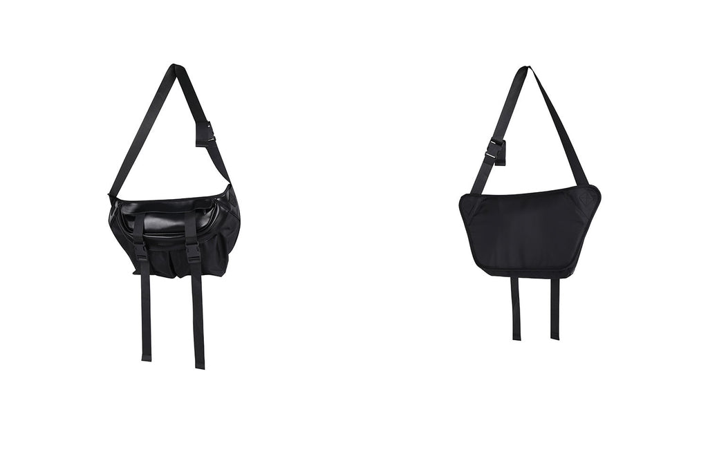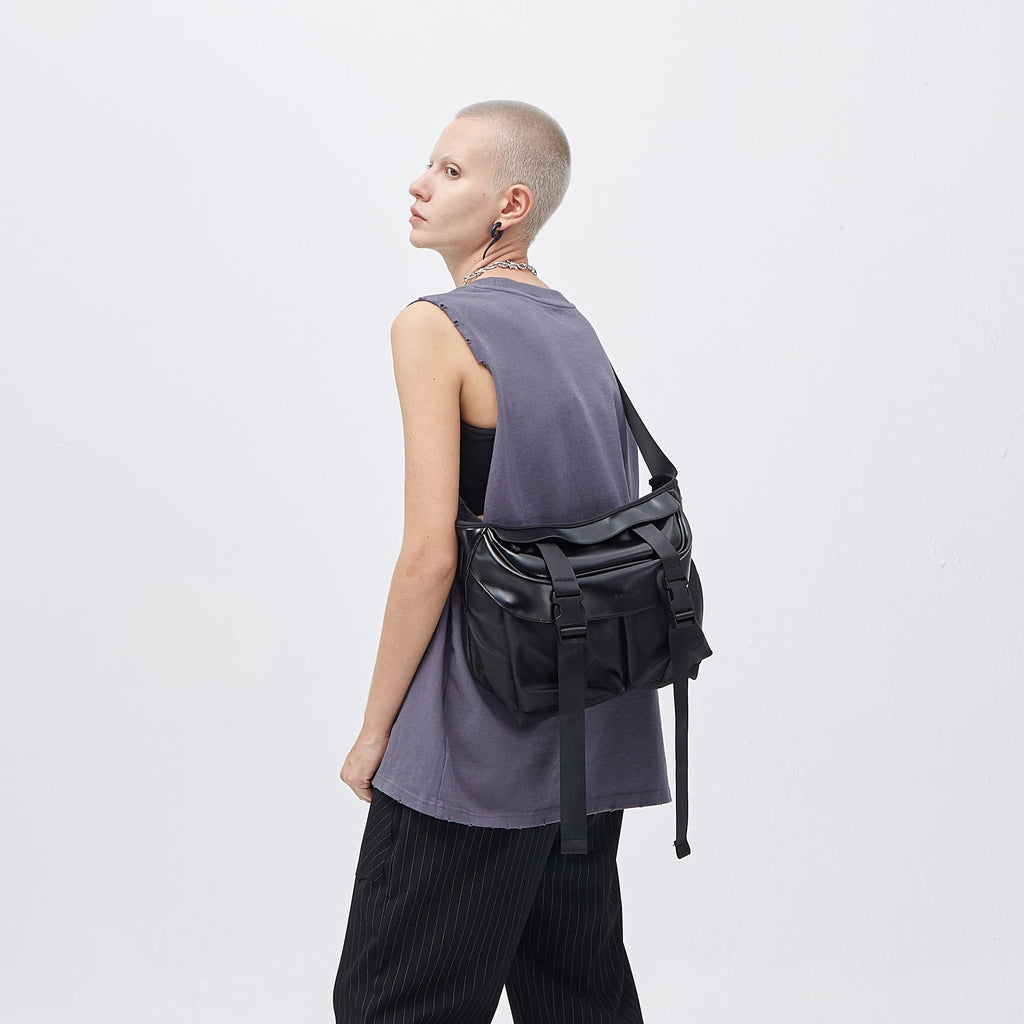 PCLP nylon and PU leather shoulder bag in black, adjustable shoulder strap with press-release buckle fastening, concealed zip pocket at interior, press-release buckles at face, foldover flap at main compartments, press-release buckles at face, waterproof.
