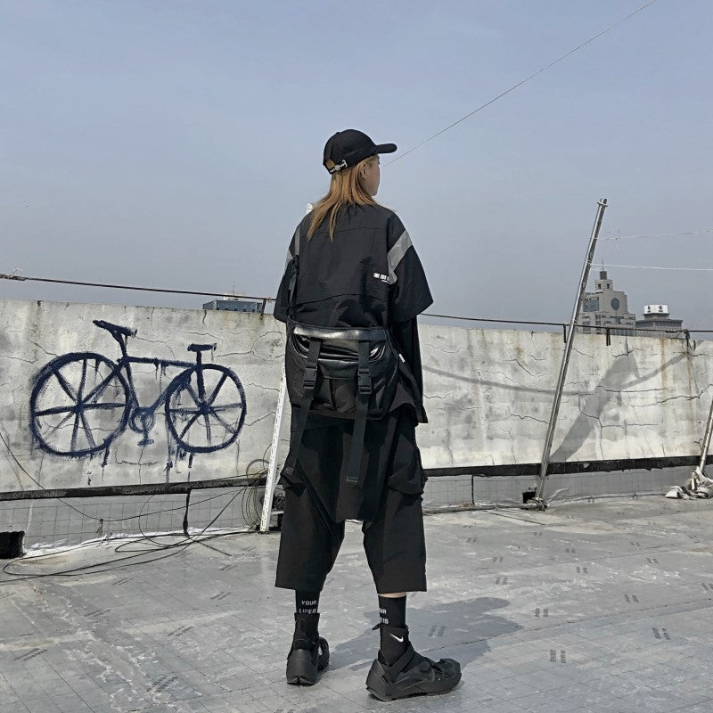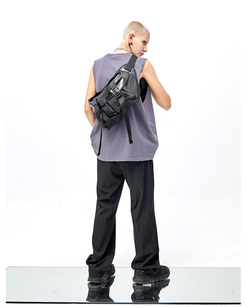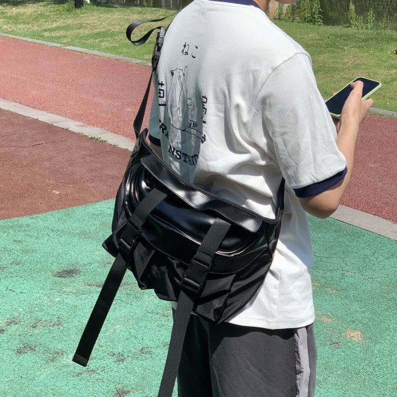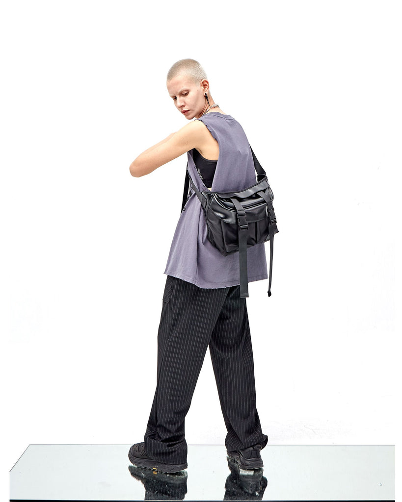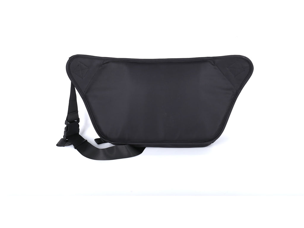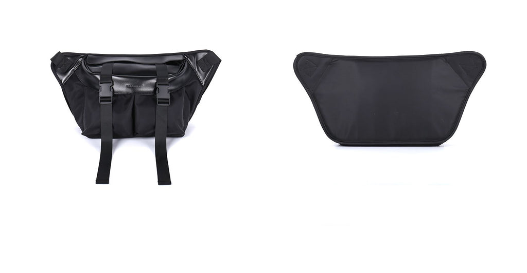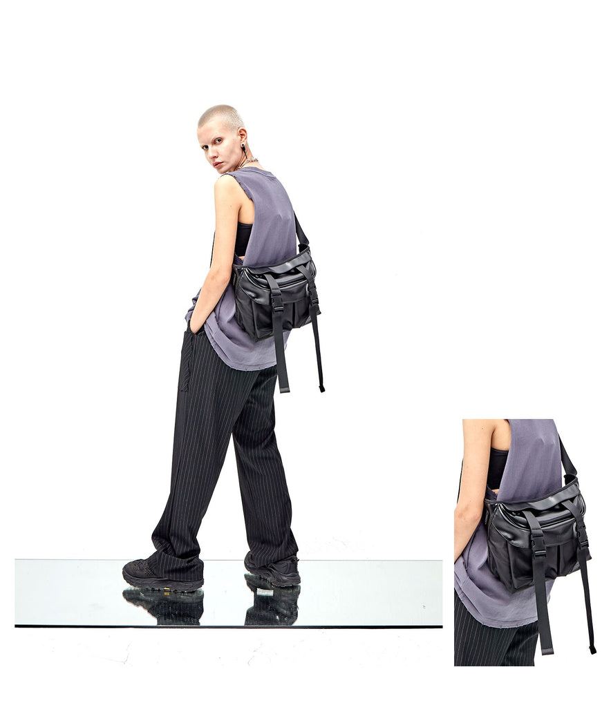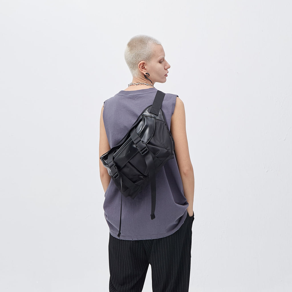 PCLP nylon and PU leather shoulder bag in black, adjustable shoulder strap with press-release buckle fastening, concealed zip pocket at interior, press-release buckles at face, foldover flap at main compartments, press-release buckles at face, waterproof.