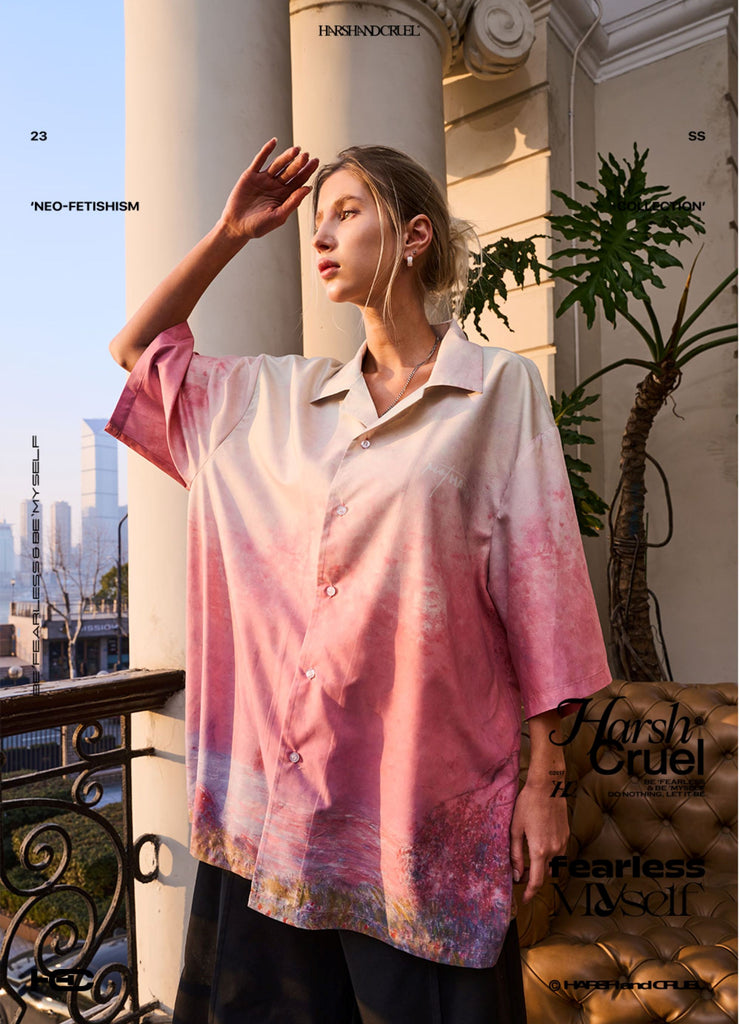 HARSH and CRUEL polyester short sleeve shirt, graphic printed throughout, open spread collar, dropped shoulders, button closure, logo printed at chest and back.