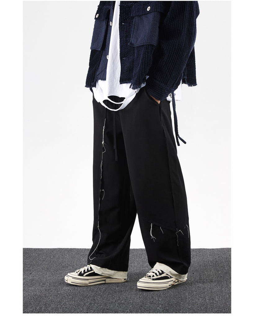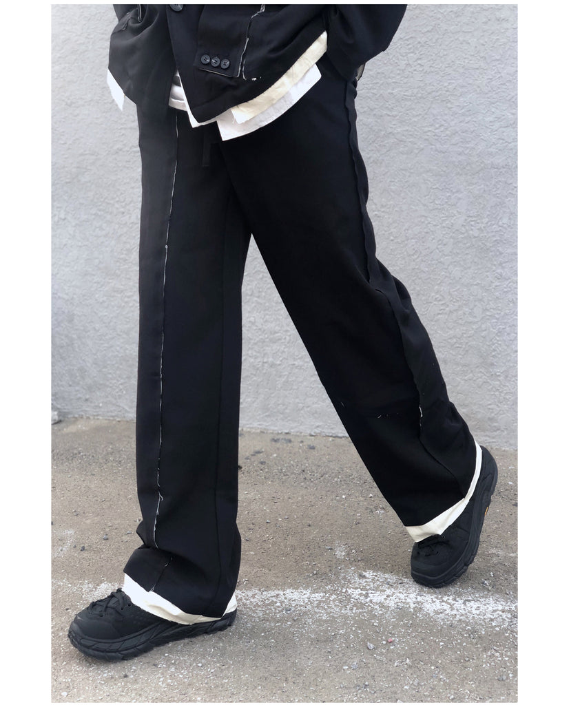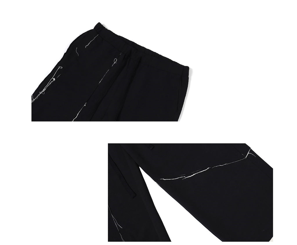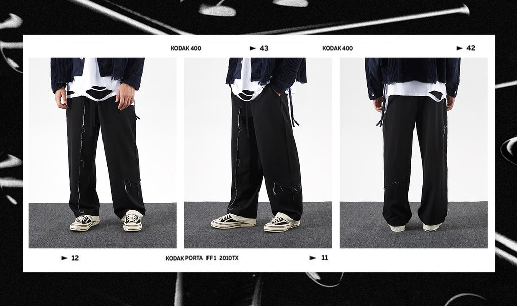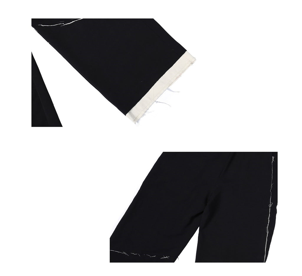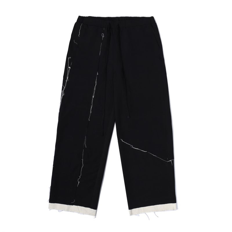 PCLP polyester-blend pants, distressing and loose thread detailing throughout, elasticized waistband, separate lining attached to hem.