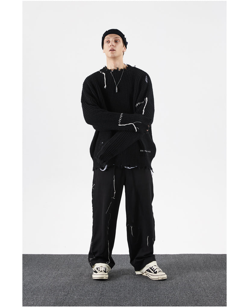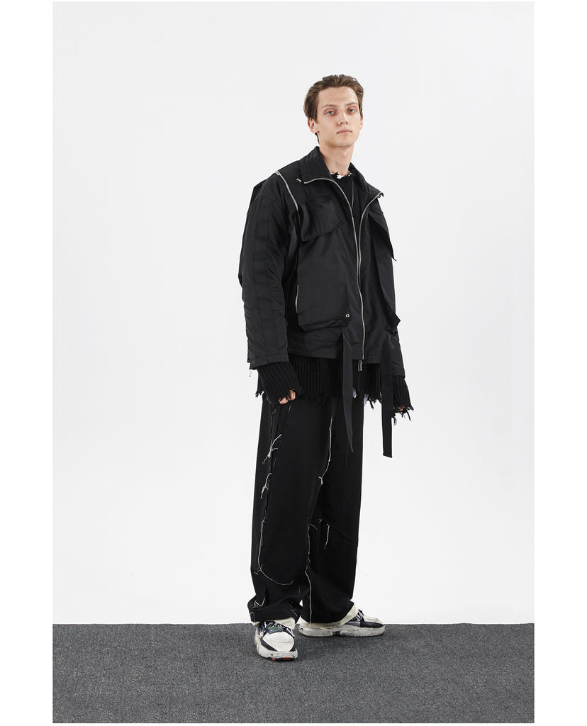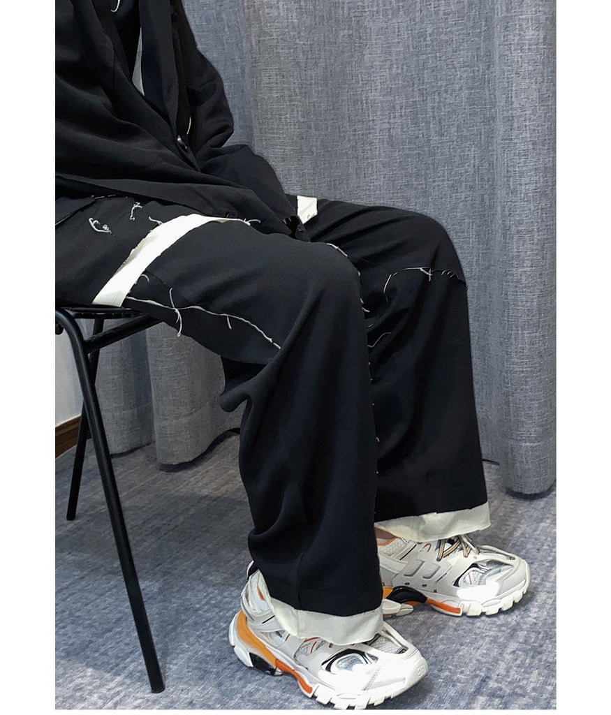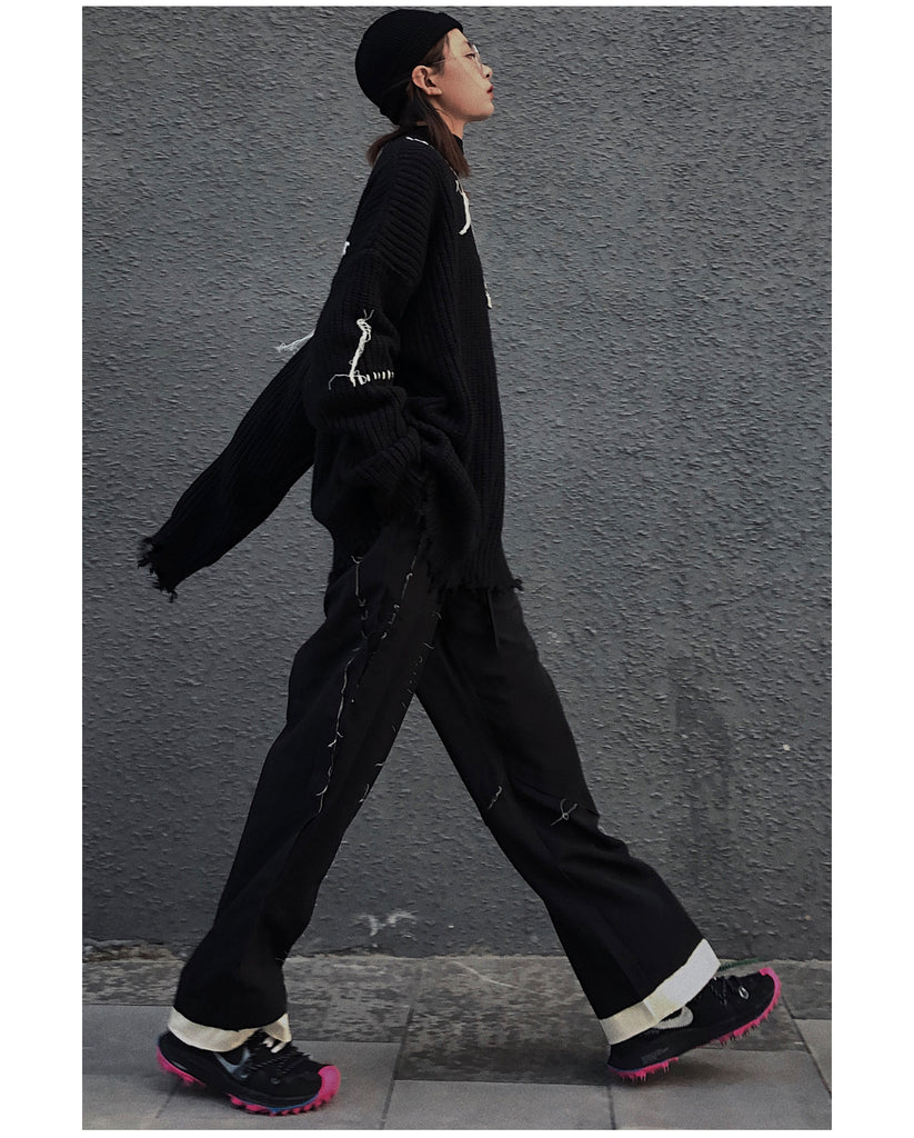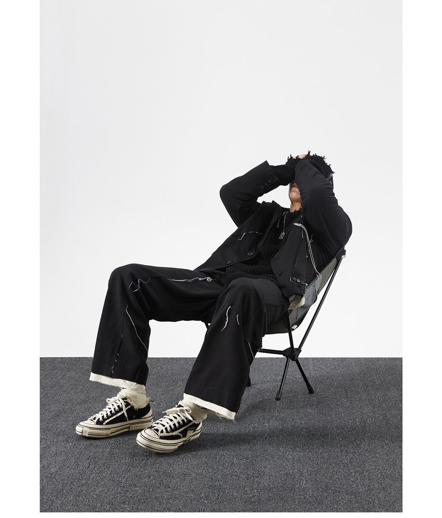 PCLP polyester-blend pants, distressing and loose thread detailing throughout, elasticized waistband, separate lining attached to hem.