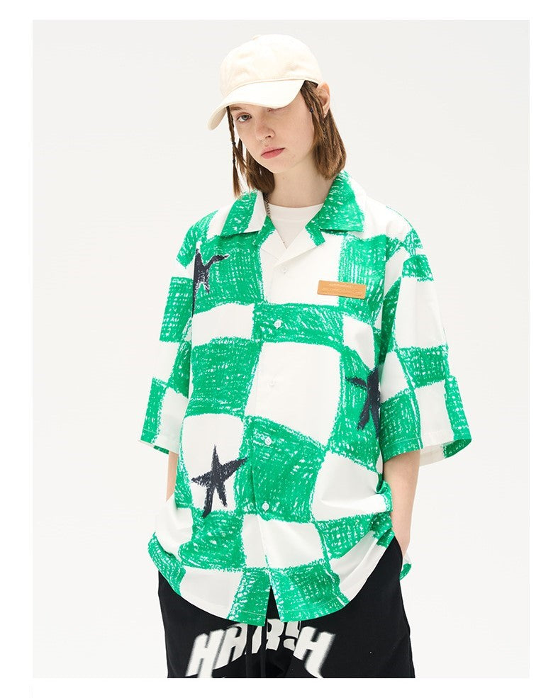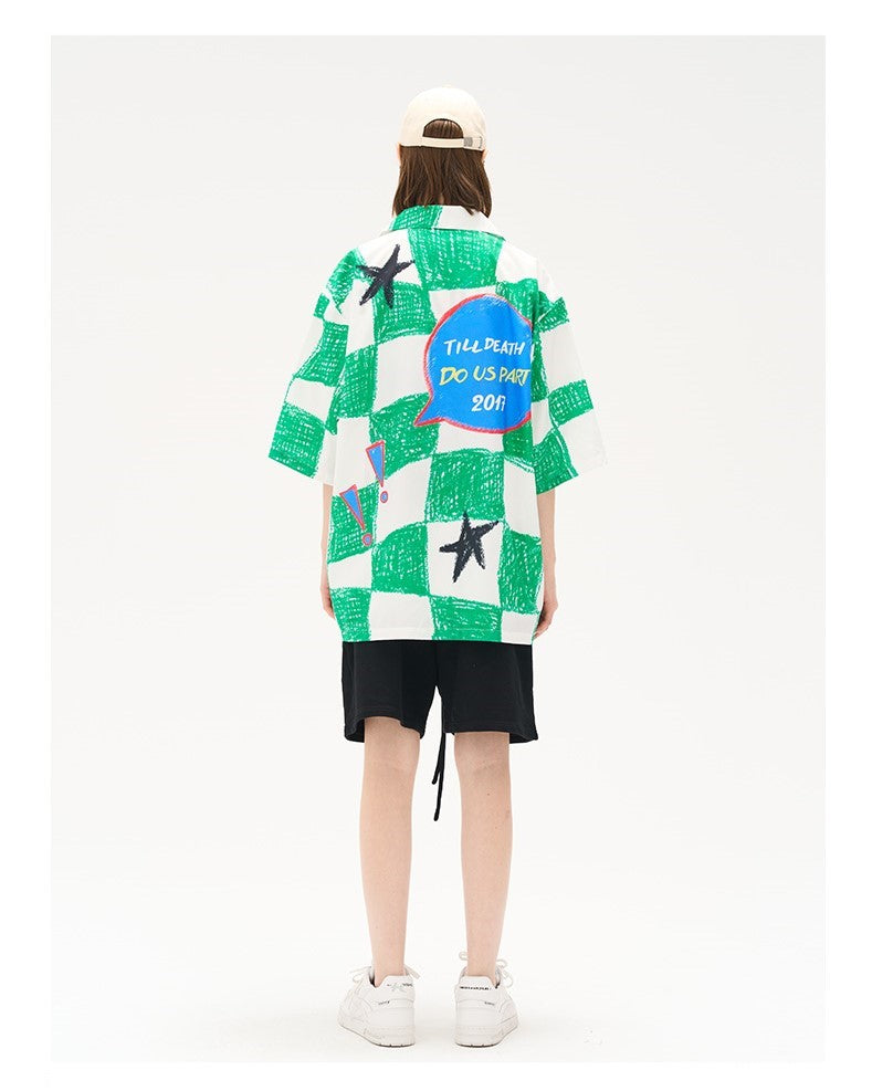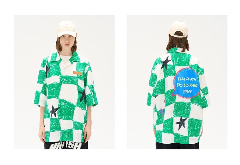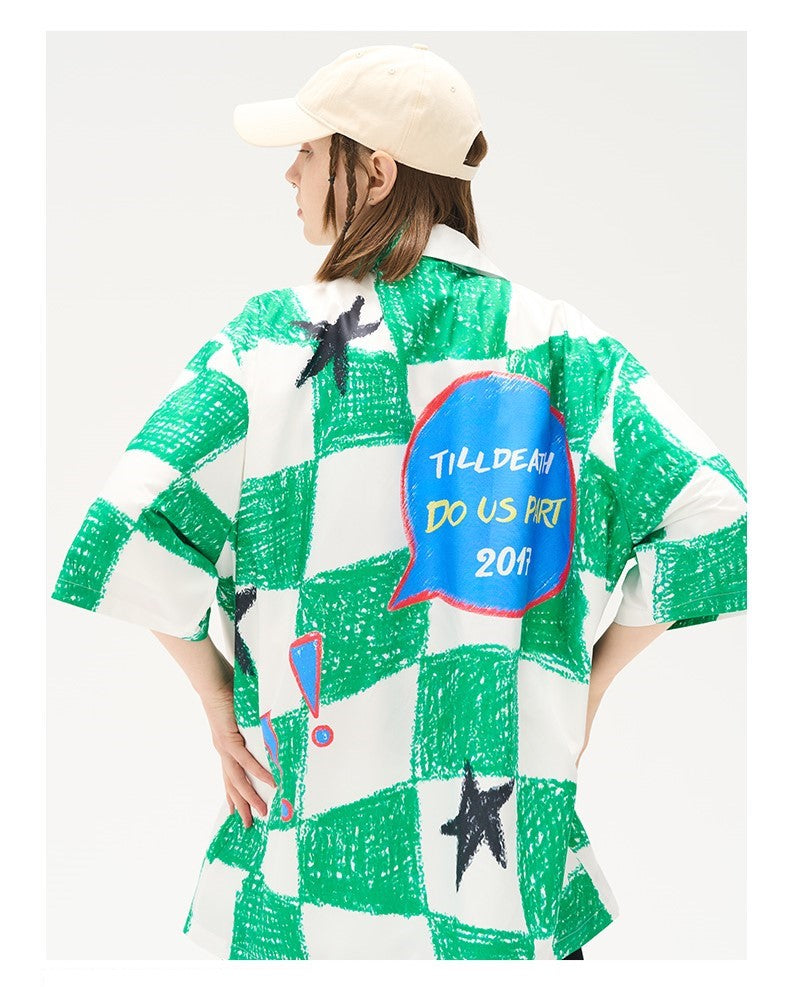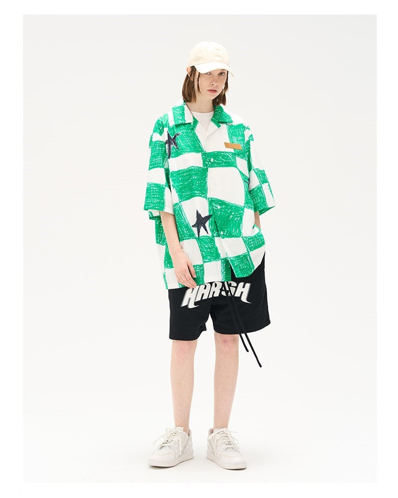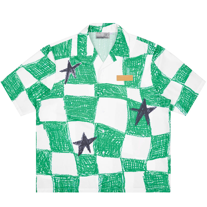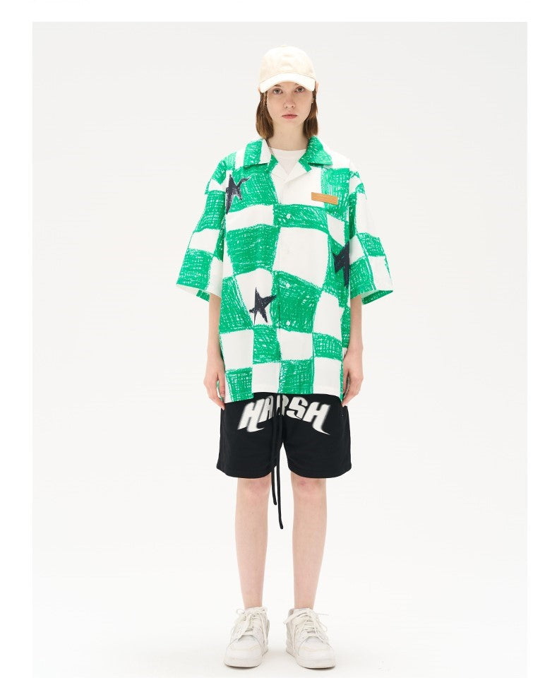 HARSH and CRUEL polyester short sleeve shirt, checkered pattern printed throughout, open spread collar, dropped shoulders, button closure, logo patch at chest, text printed at back.