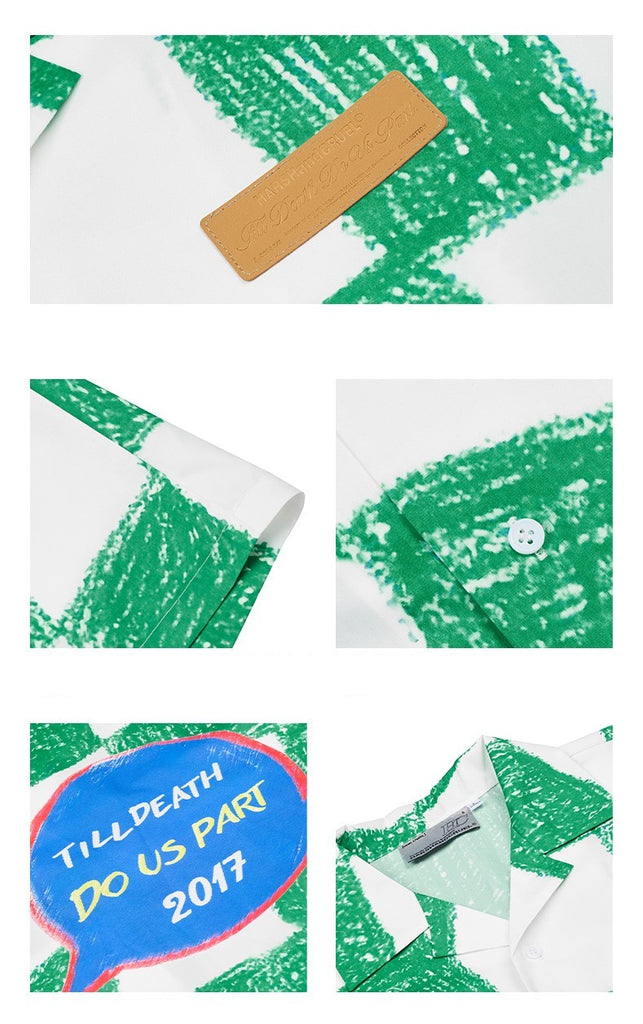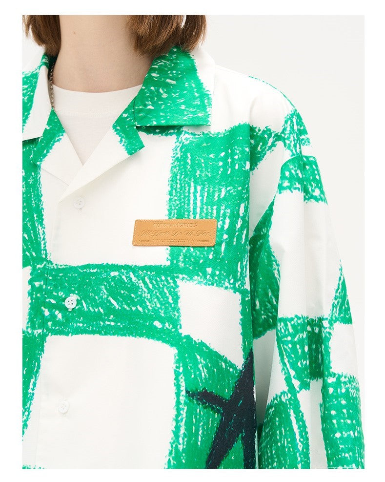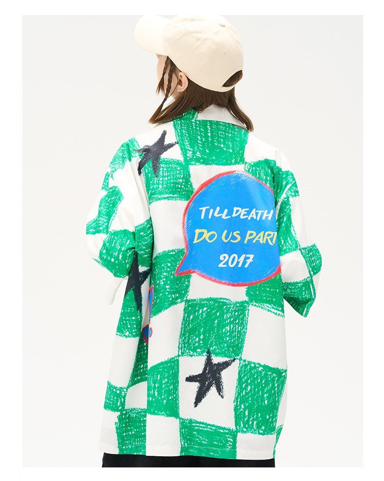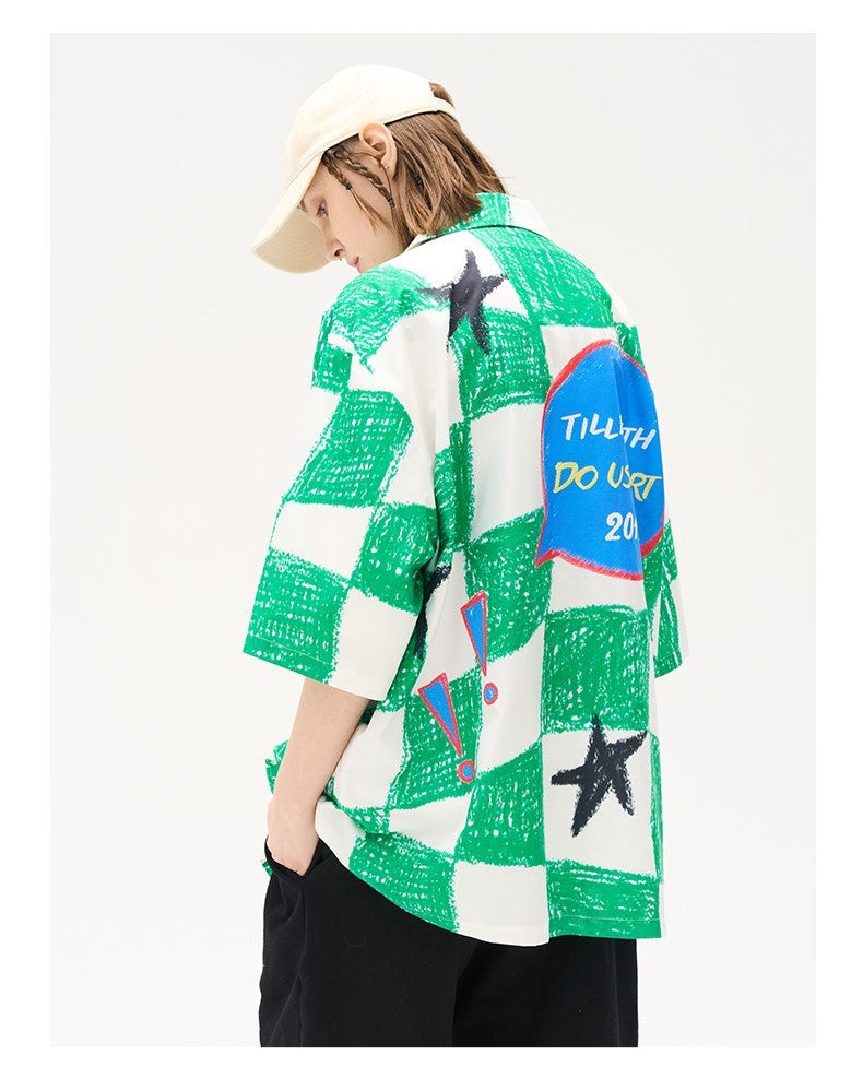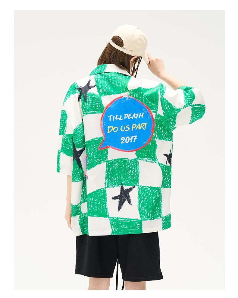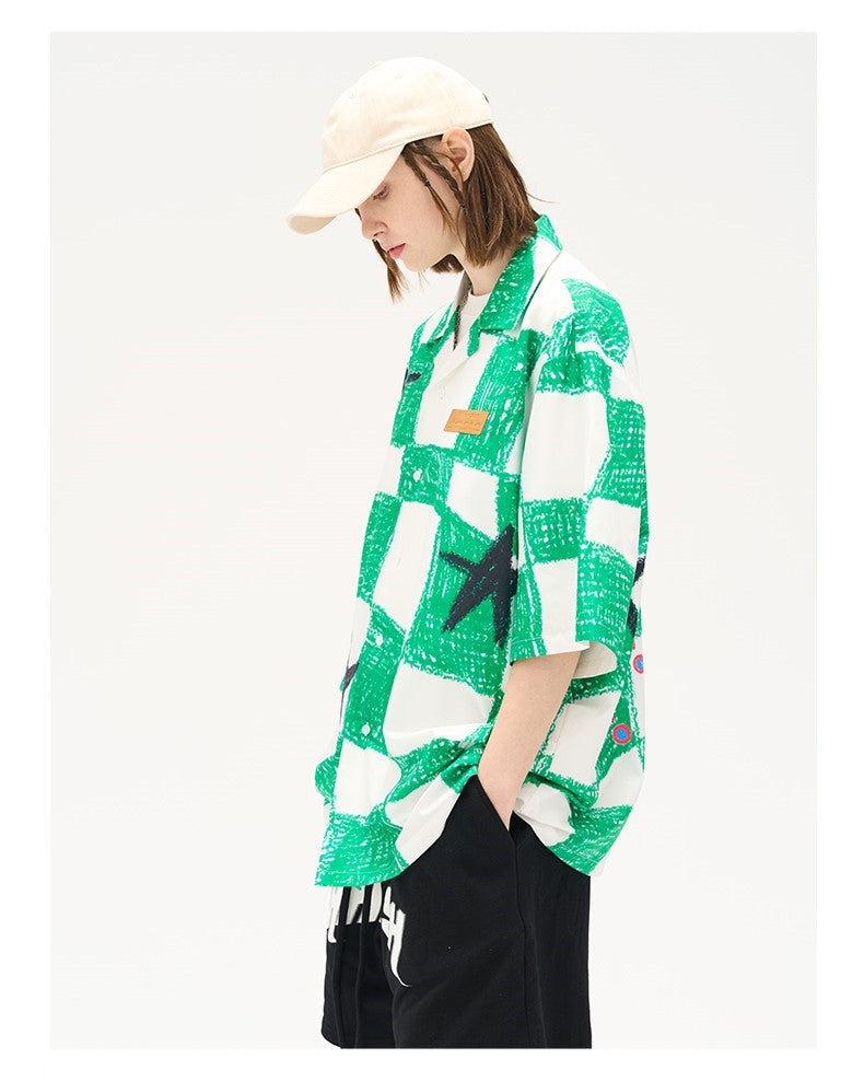 HARSH and CRUEL polyester short sleeve shirt, checkered pattern printed throughout, open spread collar, dropped shoulders, button closure, logo patch at chest, text printed at back.