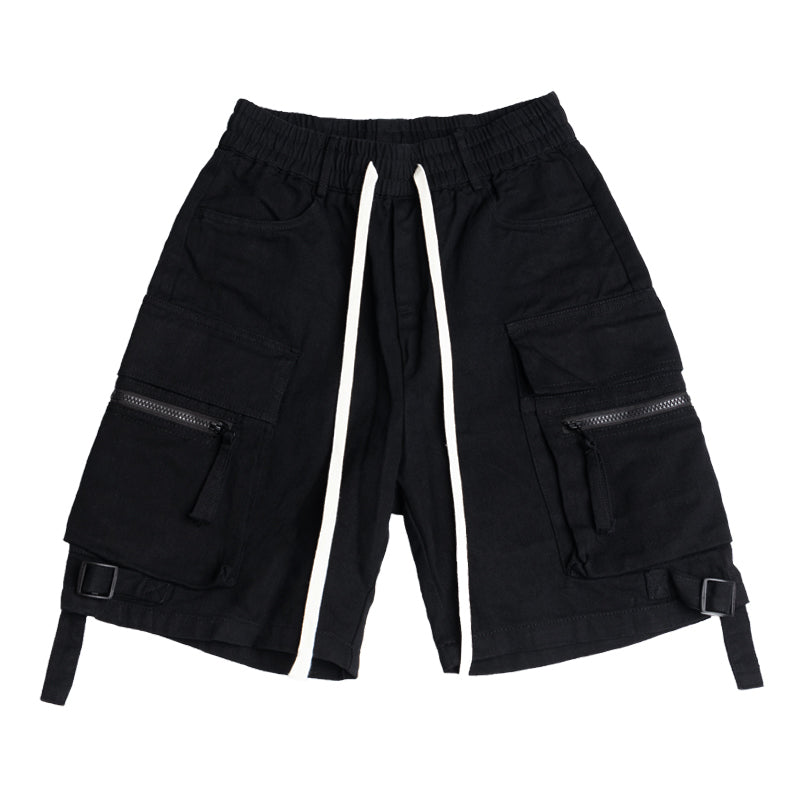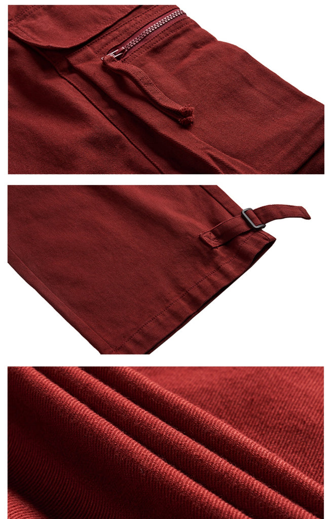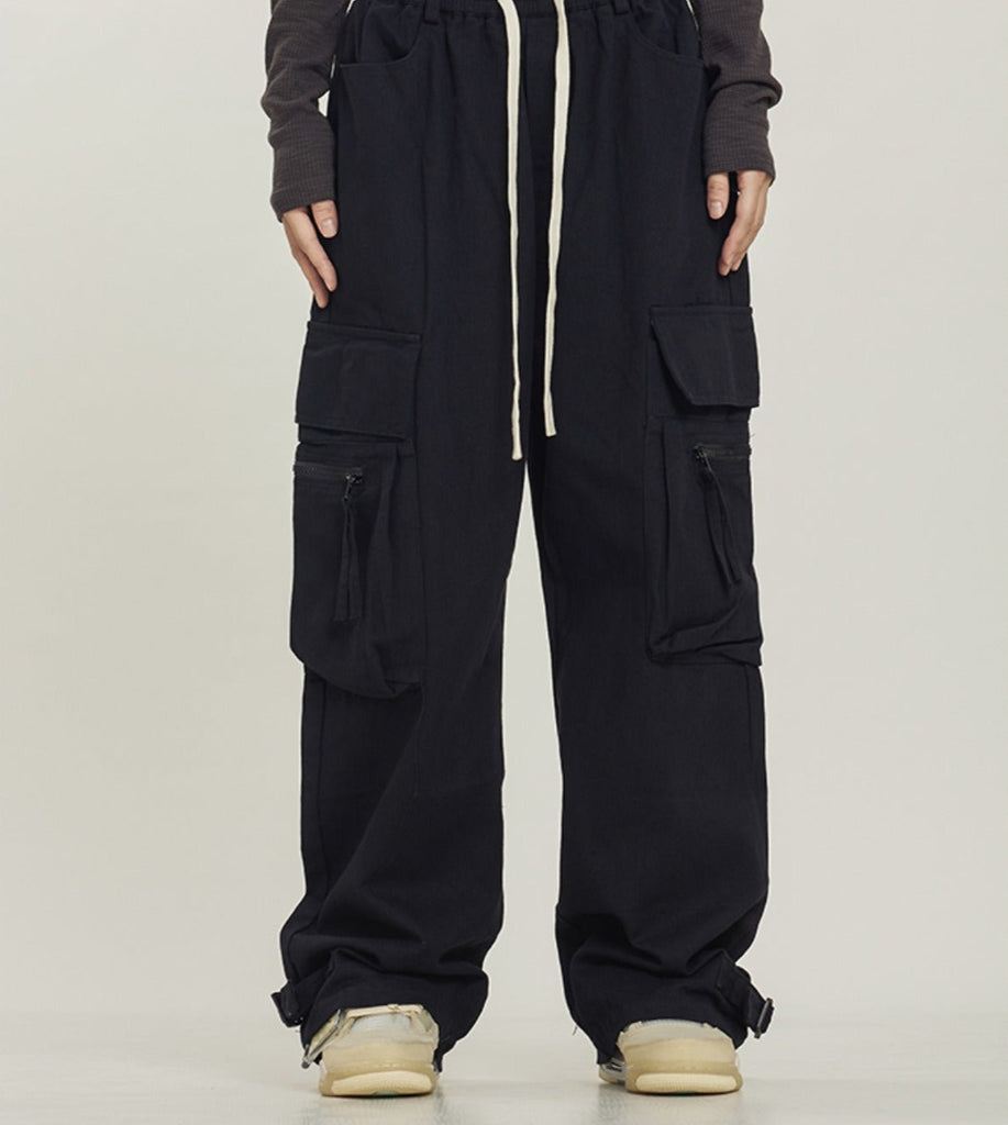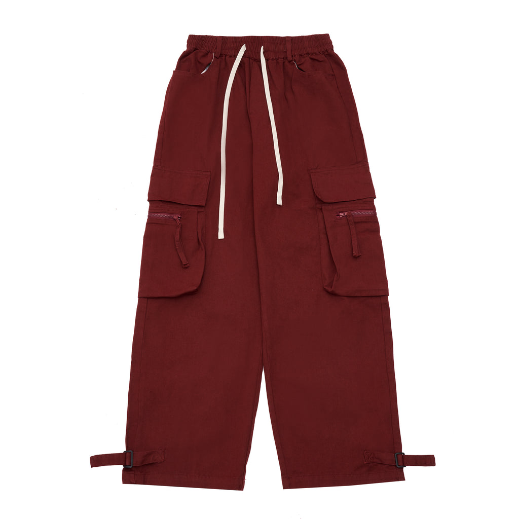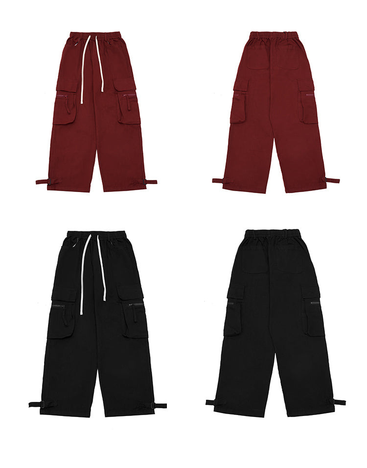 CTB cotton pants, drawstring at elasticized waistband, utility zip-patch pockets at front/side, four pocket styling, double-stitched at cuffs/outseams