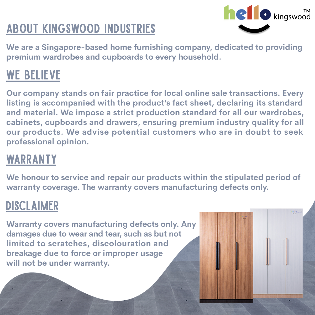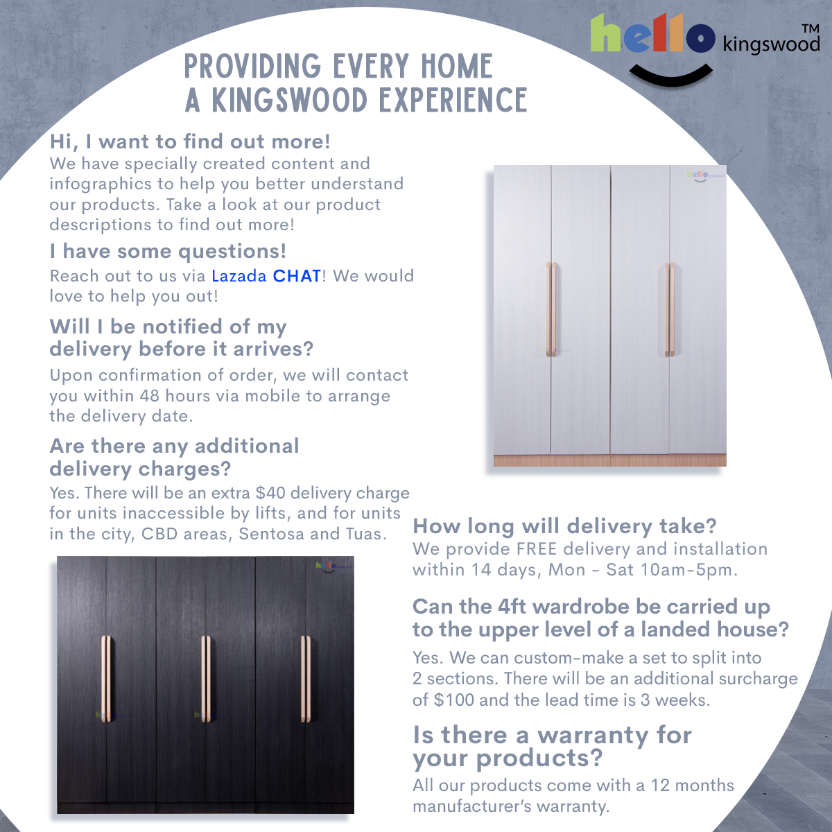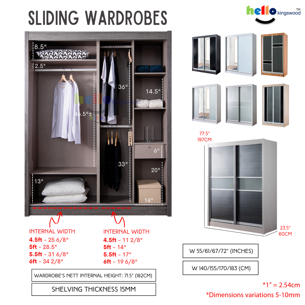 12 months manufacturer warranty Material: Solid Plywood Sturdy aluminium door frame Strong aluminium hanging bar Durable full extension drawer slides Width: 4.5, 5, 5.5, 6ft Height: 1.97m or 2.4m Depth: 60cm Models: Timo, Niko, Scanik, Megan, Joshua Available in 9 trendy colours