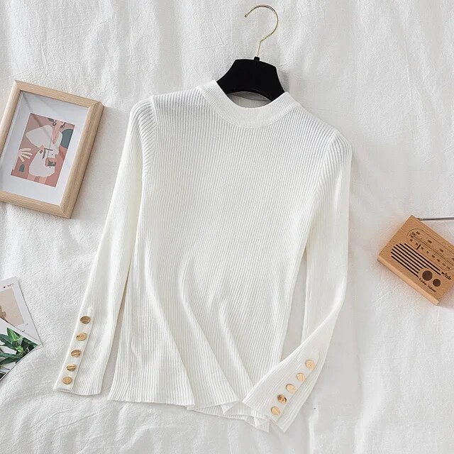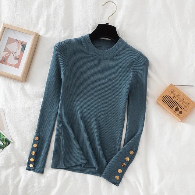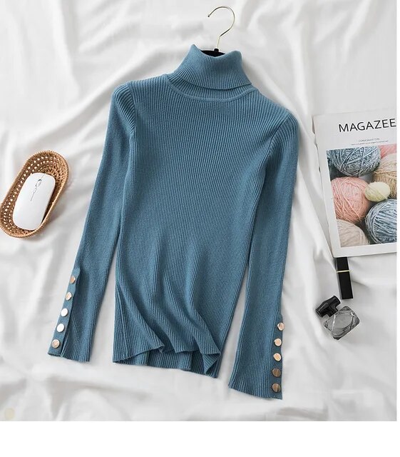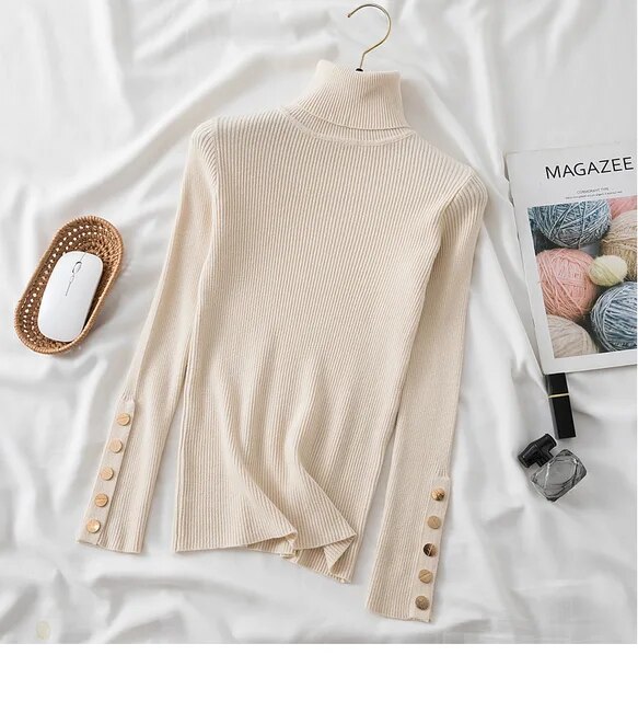 Thick Sweater Pullovers Long Sleeve Tops Women Autumn Winter Clothes Slim Knit Soft Jumper Streetwear Button Turtleneck Sweater