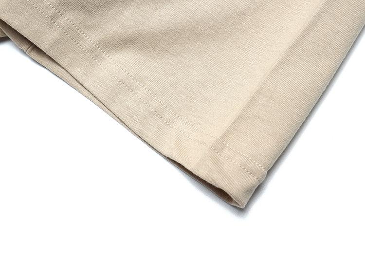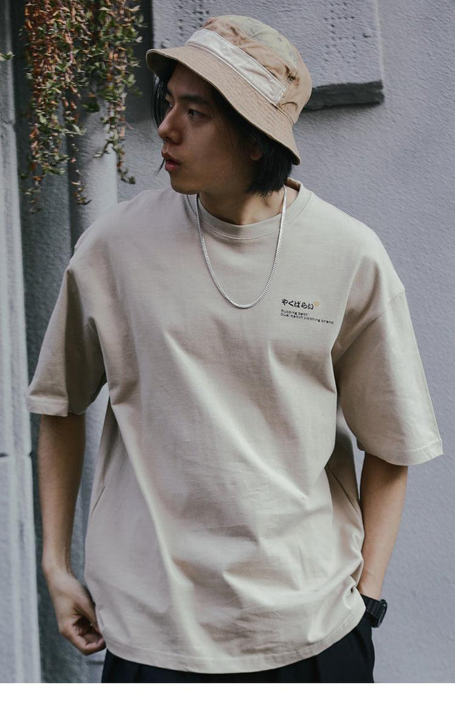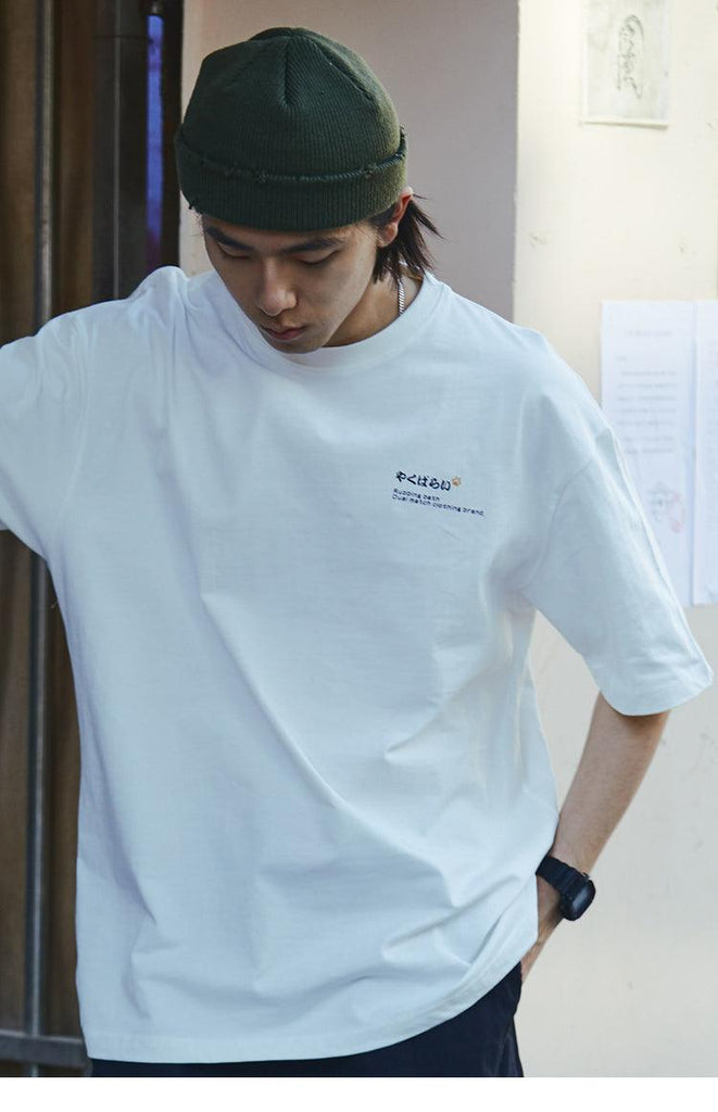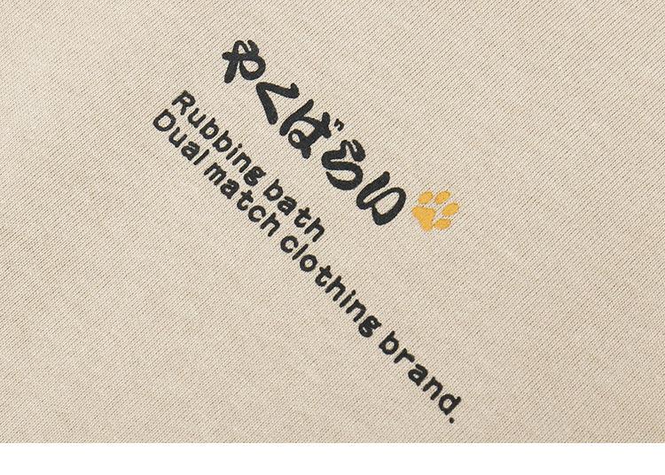 Cotton short sleeve shirt, rib knit crewneck/hem/cuffs, kanji printed at chest, cat graphic printed at back.
