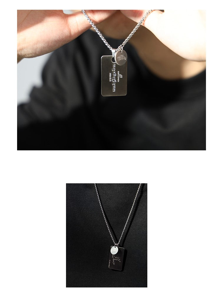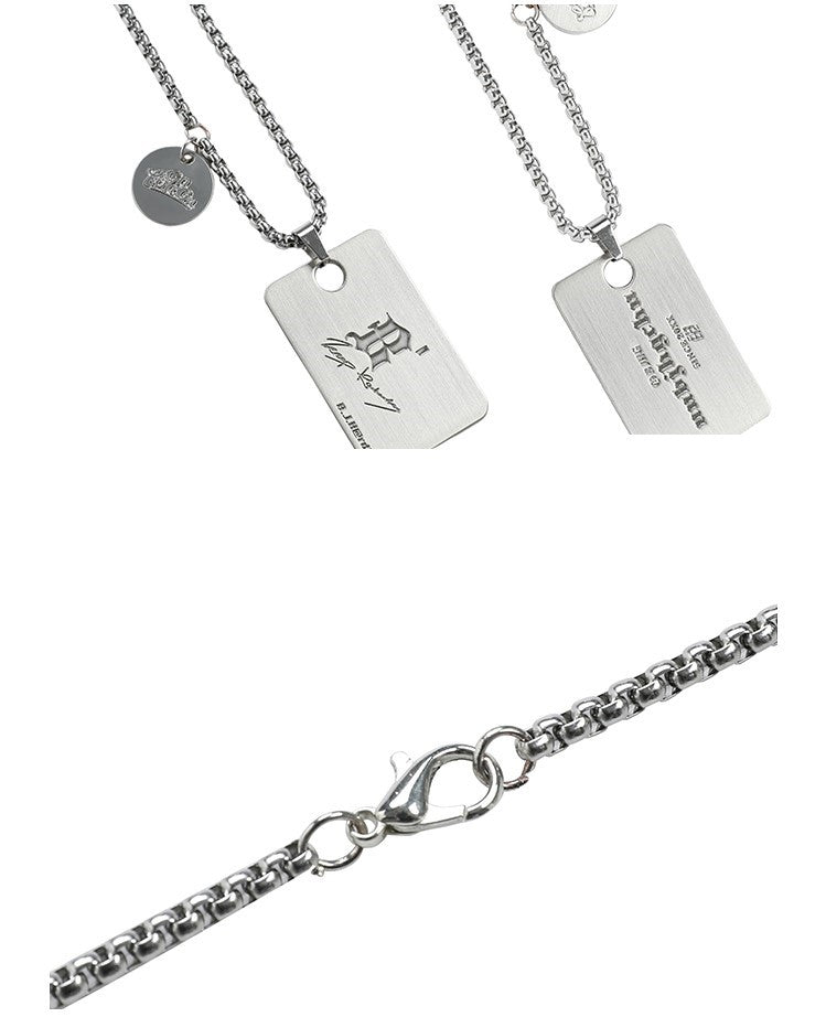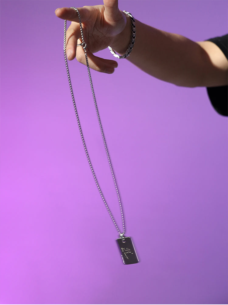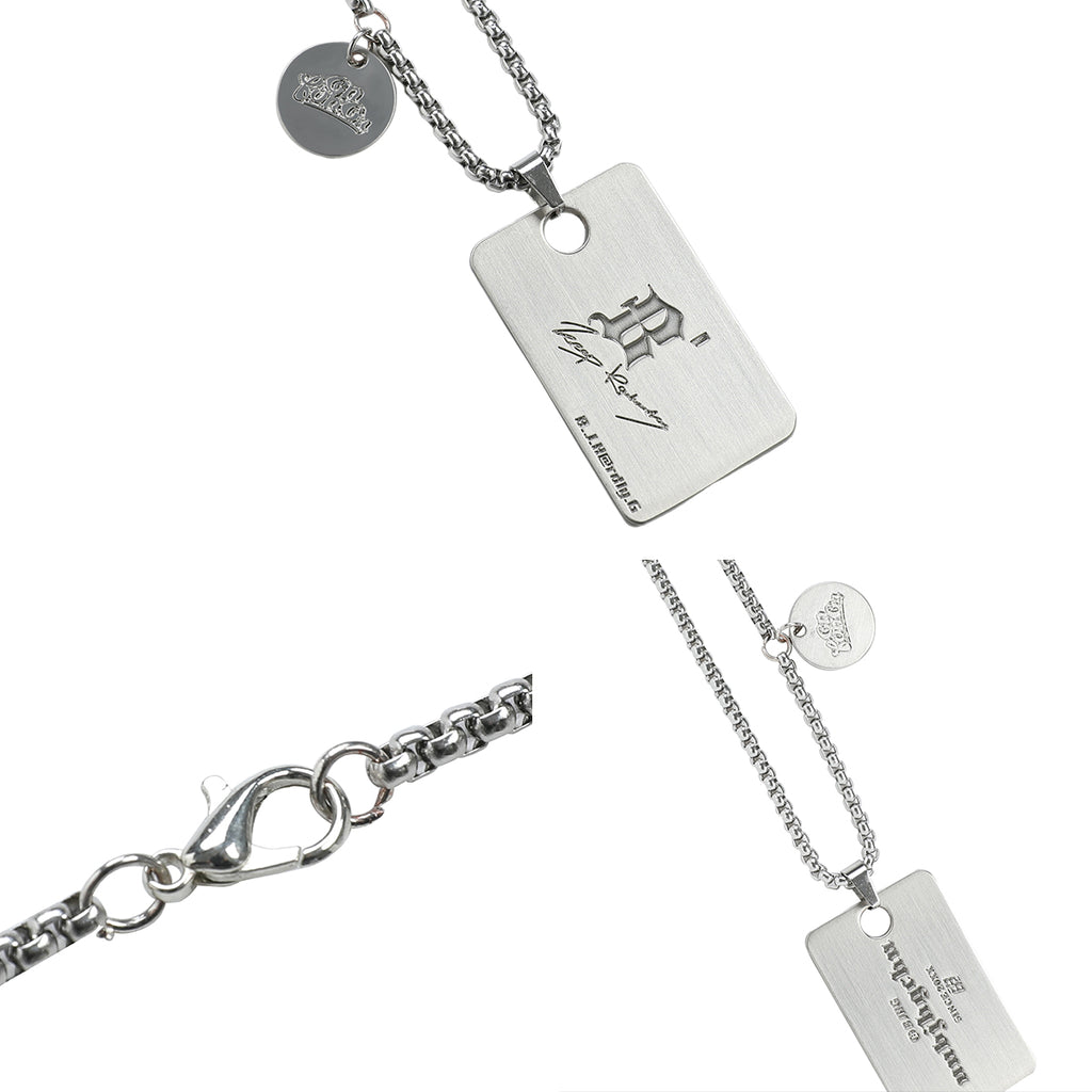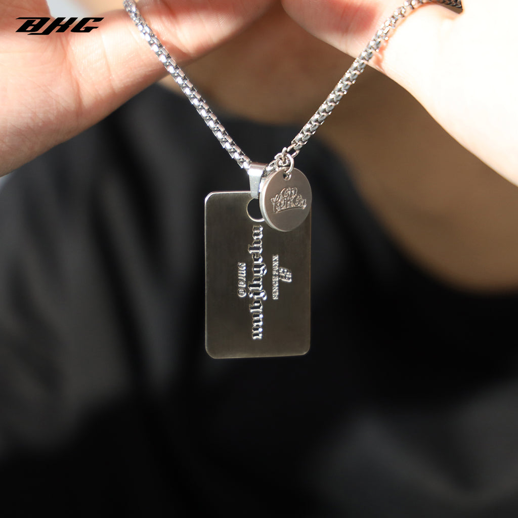 BJHG stainless steel chain necklace, logo and graphic engraved pendant at drop, lobster-clasp fastening.