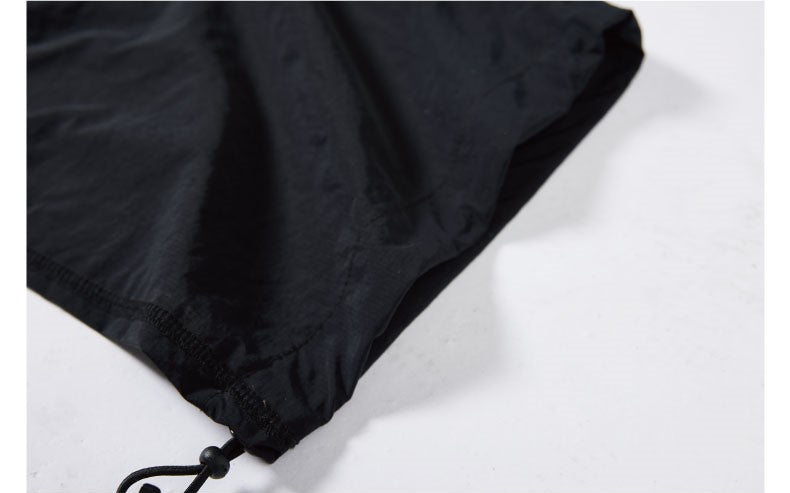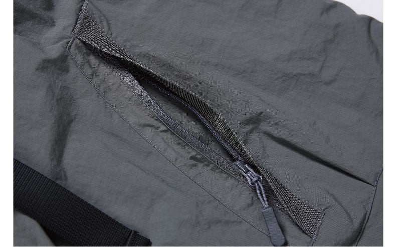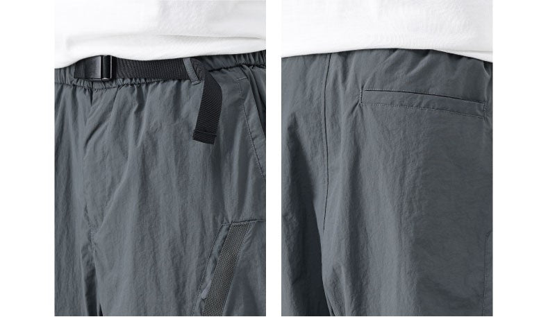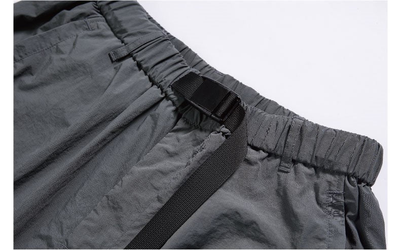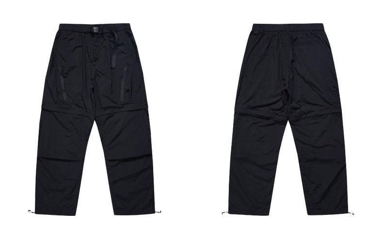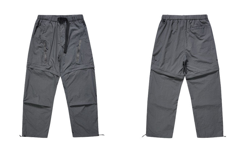 GTRG polyester and nylon-blend pants, integrated belt with cinch fastening, cargo pockets, detachable zip panels at legs, bungee-style drawstring at cuffs, breathable and waterproof.