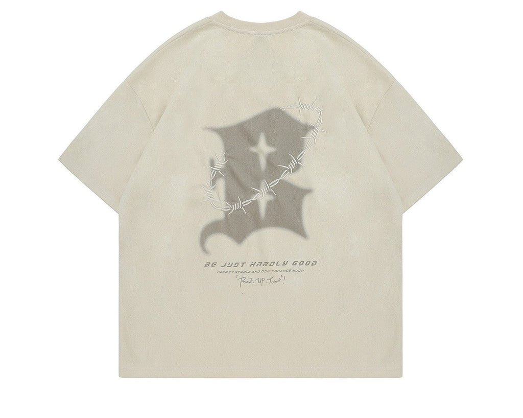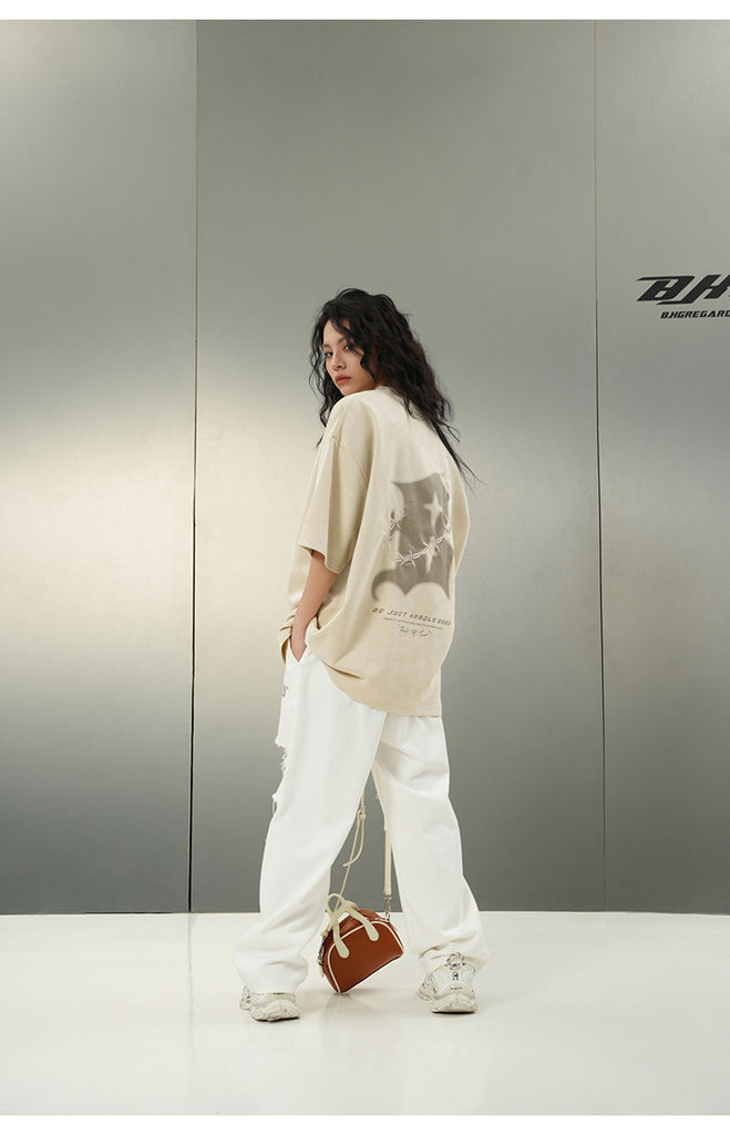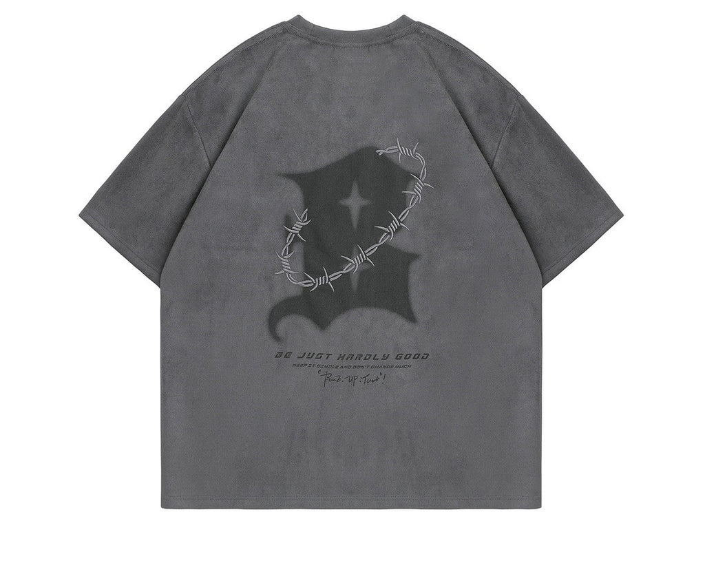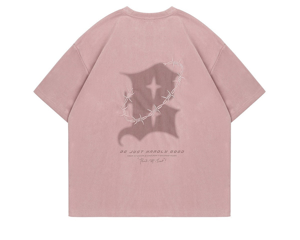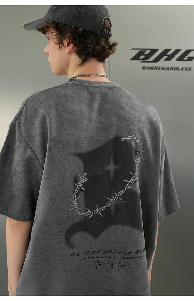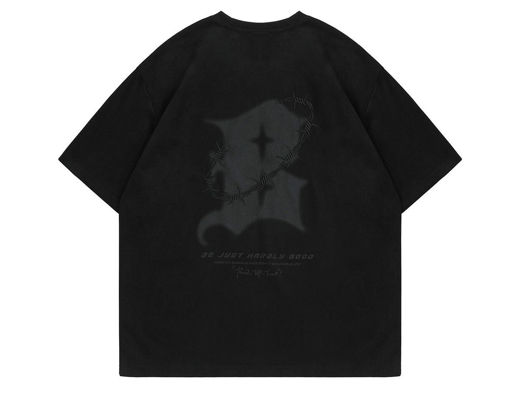 BJHG polyester shirt, rib knit crewneck/hem/cuffs, dropped shoulders, thorn embroidery and letter print at back, logo printed at chest.