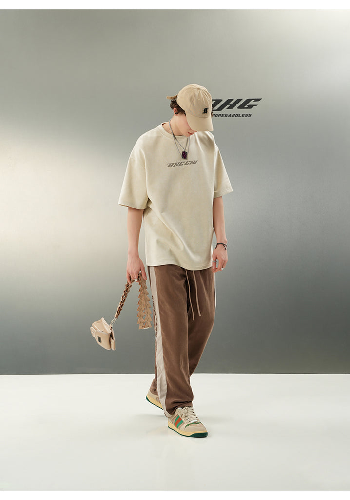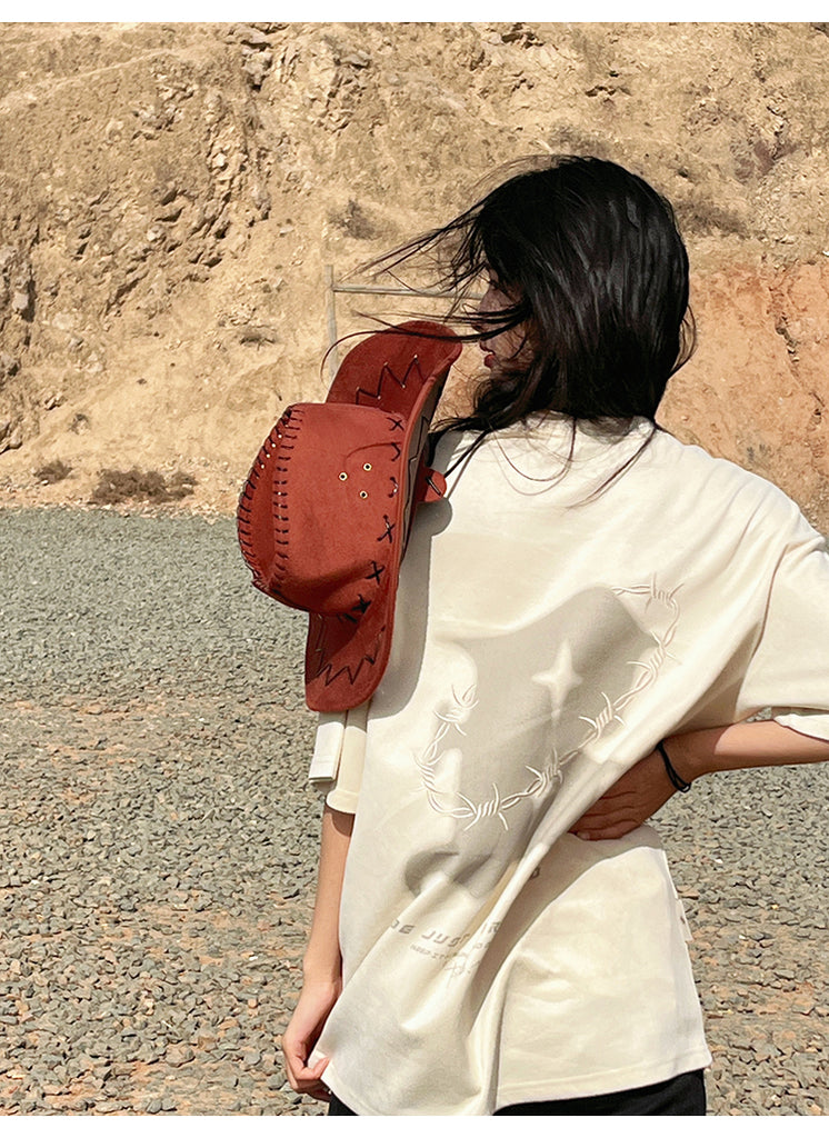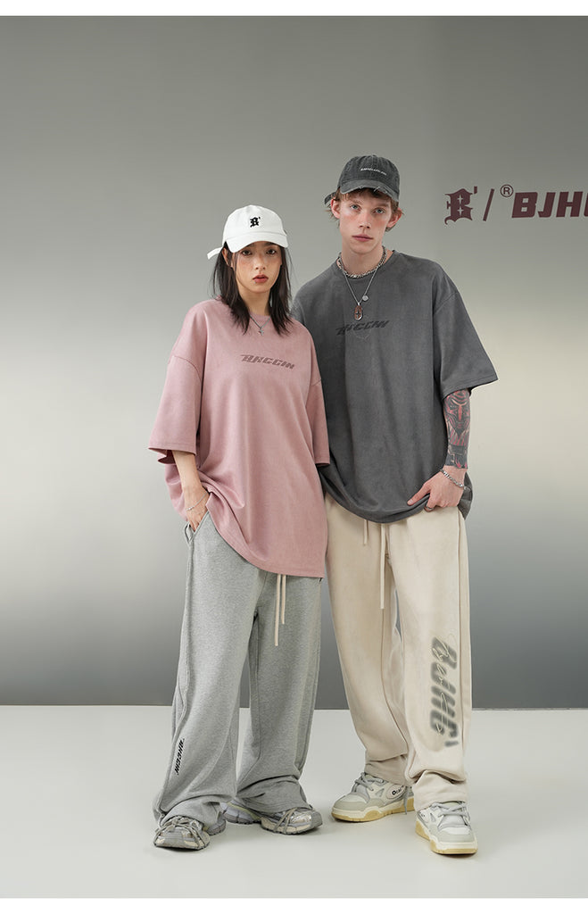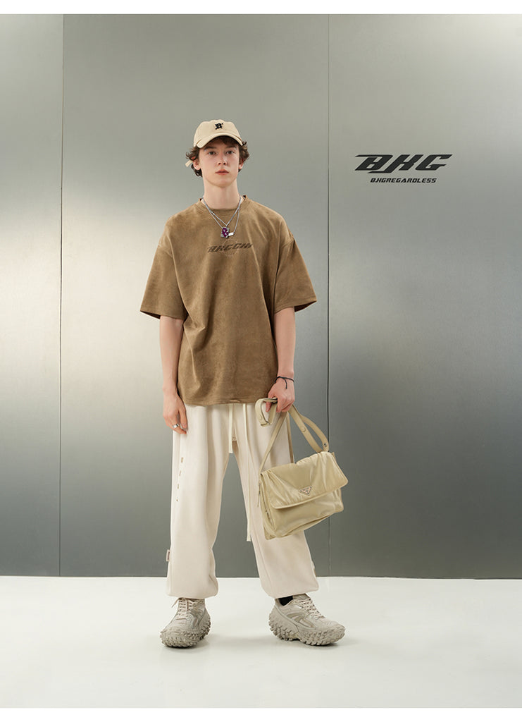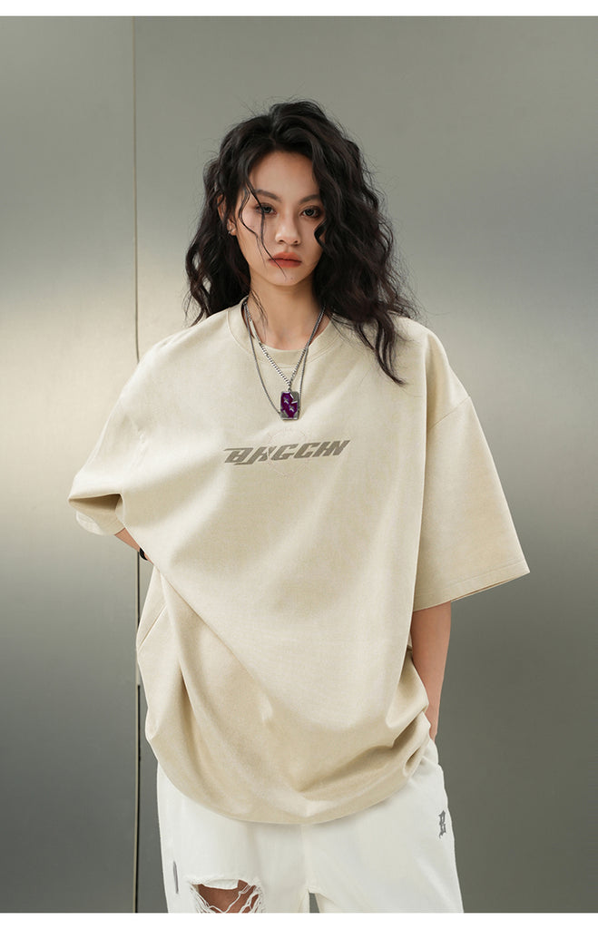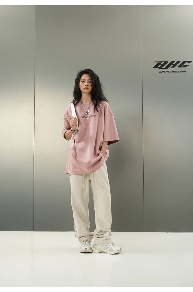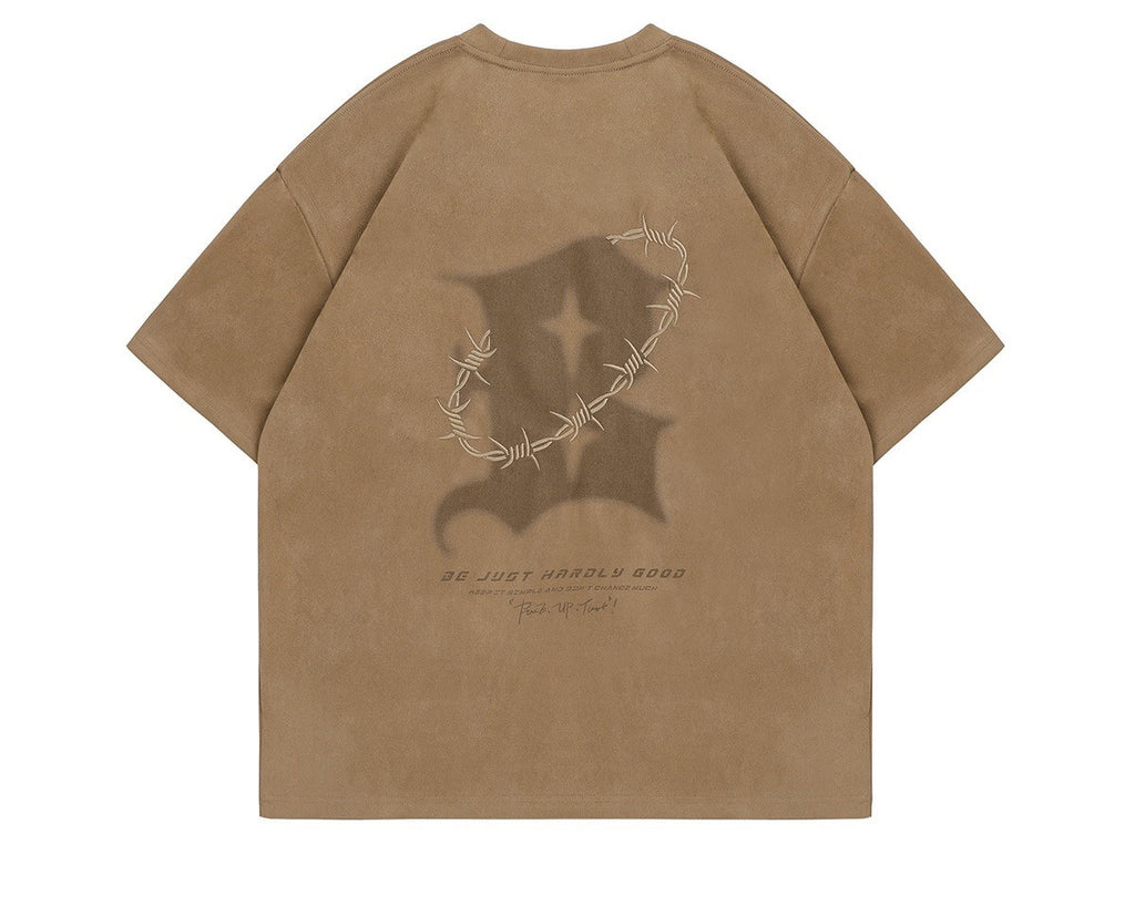 BJHG polyester shirt, rib knit crewneck/hem/cuffs, dropped shoulders, thorn embroidery and letter print at back, logo printed at chest.