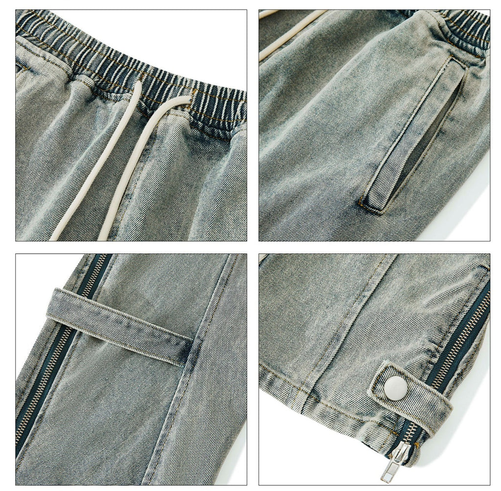 MaxDstr jean pants, drawstring at elasticized waistband, two pocket styling, cut zipper on side outseams,  double-stitched at cuffs/outseams, button closure at cuffs.