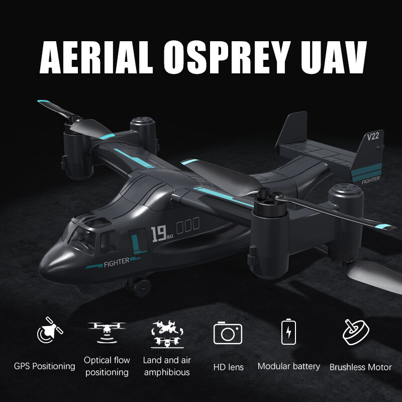 RC V-22 Osprey Drone Describe Product Name: RC V-22O Osprey Drone Camera with GPS Color: dark gray Product size(cm): 40*27*11cm(L*W*H) product weight: Aircraft 315g, remote control 124g Packe: Backpack + Box Backpack size : 42*31*13.8cm Battery Type: polymer battery Battery parameters: Play time: about 18 minutes Charging time: 120 minutes Charging mode: USB Battery for Remote control: 3 AA (not included) Remote control distance: 800m Remote control height: 120m Gharging line protection measures:None, conventional 2A environmental protection Android cable Product battery protection measures: Charging protection and short circuit protection