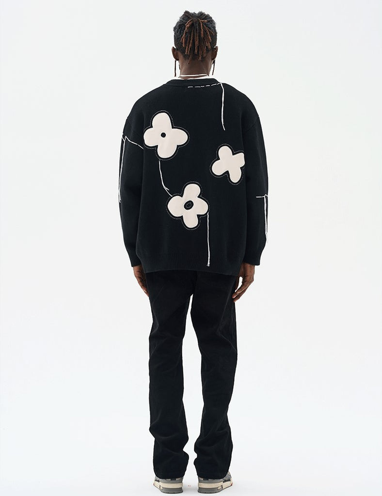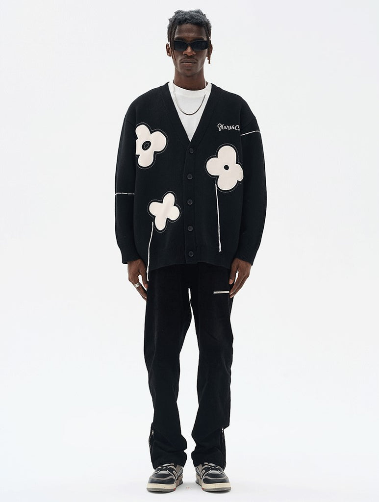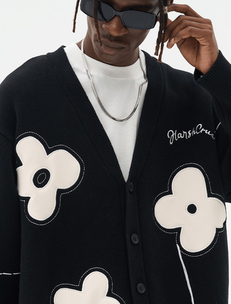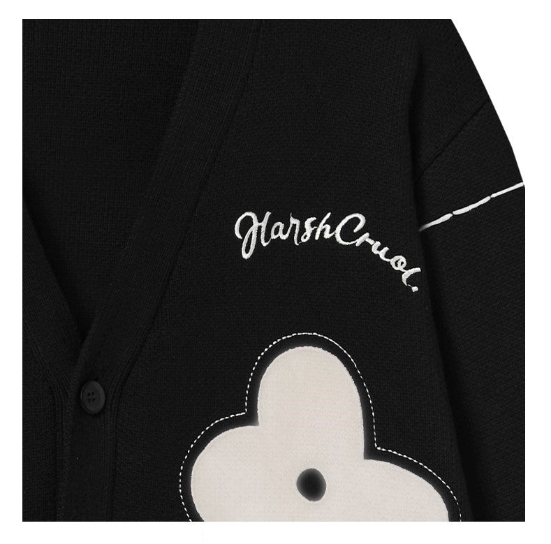 HARSH and CRUEL cotton cardigan, loose thread detailing and stitched flower pattern throughout, rib knit Y-neck, hem and cuffs, button closure, logo sewn at chest.