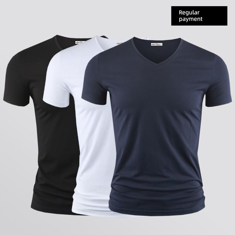 Modal Men's Solid Color and V-neck Slim-Fit Ice Silk Short Sleeve Shirt