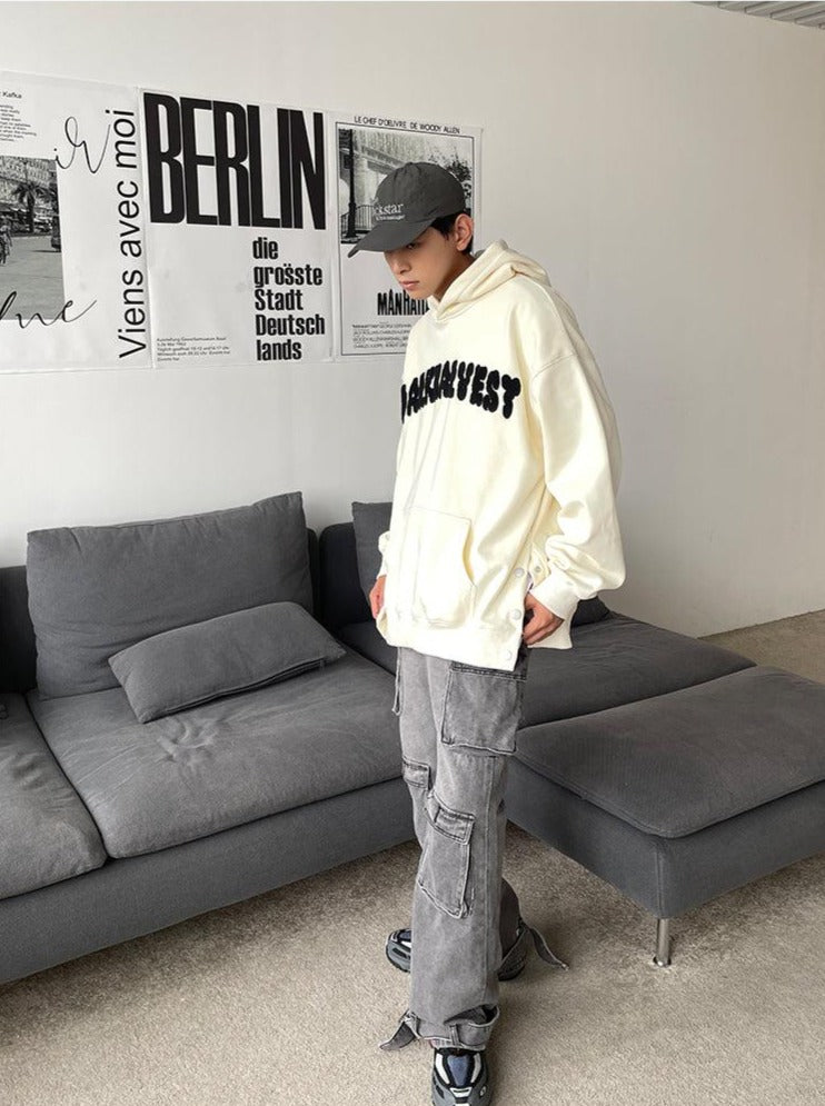 Heavy cotton hoodie, ribbed cuffs/hem, kangaroo pocket, button closure at seams, plastisol puff print logo at chest, embroidered star patch on hood.